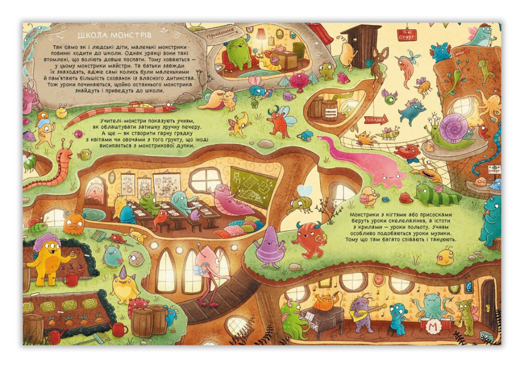 Усе-усе про монстрів в одній яскравій книжці. Тепер немає сенсу боятися цих страховиськ, адже вони, виявляється, такі милі й багато в чому нагадують дітей. Полюбляють смачненьке, грають у хованки-наздоганялки, ходять до школи, хоча й не хочуть рано прокидатися. А ще облаштовують собі домівки-печери під землею, під водою, в горах... або ж просто вдома із ковдр. Напрочуд цікаво роздивлятися монстрів і монстриків на веселих ілюстраціях.