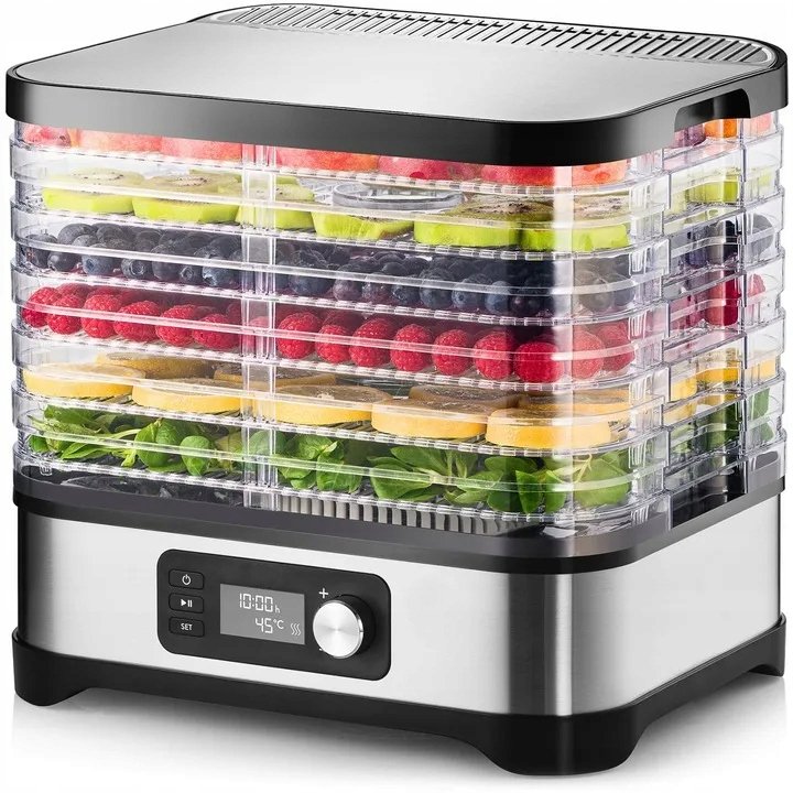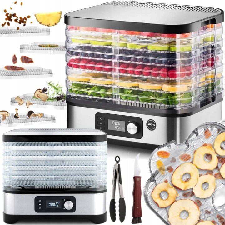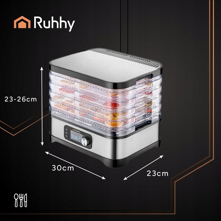 Uniwersalna suszarka RUHHY o mocy 400 W umożliwia suszenie grzybów, owoców, warzyw i ziół – ma aż 5 tacek o łącznej pojemności 10 litrów, regulowaną temperaturę (35–70°C) oraz czytelny wyświetlacz z programatorem do 72 godzin. W zestawie znajdują się również tacki do płynnych produktów, siatki i maty nieprzywierające – dla maksymalnej wygody. Energooszczędna i wykonana z bezpiecznych materiałów BPA FREE – idealna do domowej spiżarni przez cały rok.