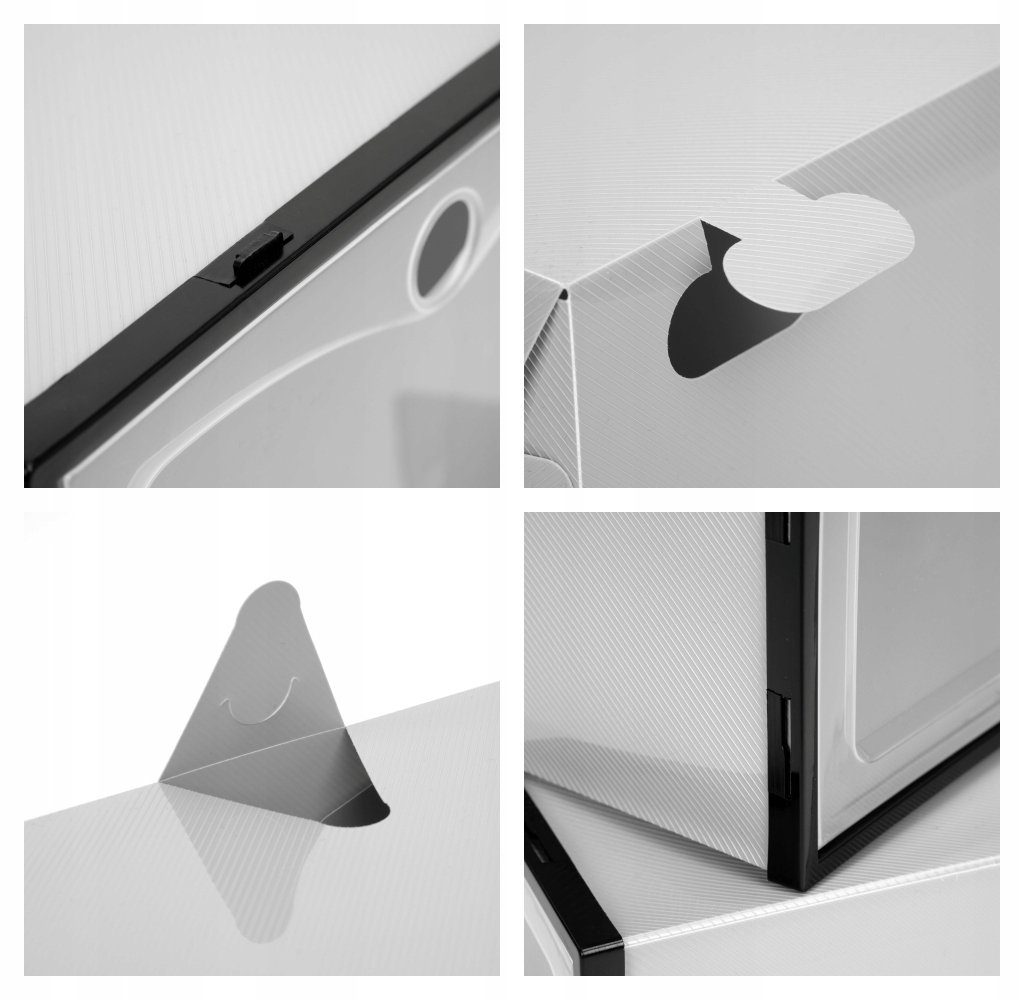 Zestaw 10 składanych pudełek na buty OSLO to idealne rozwiązanie dla osób ceniących porządek i funkcjonalność w garderobie. Każde pudełko posiada przezroczystą klapkę z otworem, która pełni rolę okienka, ułatwiając szybkie odnalezienie odpowiedniej pary butów. Wykonane z lekkiego i trwałego tworzywa PP, pudełka są łatwe w transporcie. Solidna przednia ramka z dwoma haczykami umożliwia modułowe układanie pudełek, tworząc estetyczną i zorganizowaną przestrzeń. Dodatkowe wycięcia pełniące rolę haczyków zapewniają możliwość łączenia pudełek i ich lepszą stabilność, co sprawia, że jest to doskonałe rozwiązanie do przechowywania obuwia w małych i dużych przestrzeniach, takich jak korytarz czy garderoba.