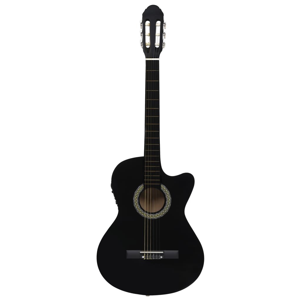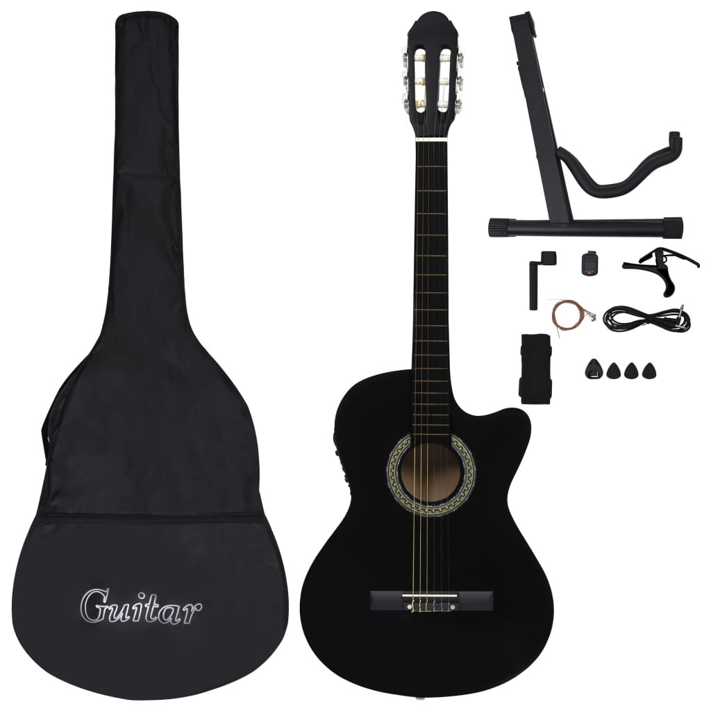 Nasza westernowa gitara z wycięciem to świetny instrument dla początkujących, amatorów i muzyków na każdym poziomie. Oprócz gitary w zestawie znajduje się pokrowiec na gitarę, pasek, kostki, uchwyt na kostkę, zestaw strun, korbka do strun, kapodaster, tuner chromatyczny i stojak na gitarę. Gitara jest wykonana z litego drewna lipowego z kluczami i podstrunnicą z twardego plastiku. Ma 6 strun i 4-pasmowy equalizer. Po podłączeniu do głośnika equalizer oferuje funkcję strojenia gitary. Doskonała jakość dźwięku i piękny design sprawiają, że instrument jest bardzo ceniony. Ta gitara o długości menzury wynoszącej 65 cm ma wszystko, czego potrzebujesz, aby zostać gitarzystą lub gitarzystką. Tuner pozwala lepiej nastroić struny gitary, a kapodaster dopasować tonację. 3 kostki służą do szarpania strun i można je umieścić w uchwycie. Zwykle służą w zastępstwie palców, ale można też grać nimi i palcami jednocześnie. Korbka do strun to przydatne narzędzie, ułatwiające wymianę strun. Dołączony pokrowiec z paskiem jest idealny dla podróżujących muzyków i ułatwia przechowywanie instrumentu. Dodatkowo możesz umieścić gitarę na stojaku, co jest bardzo wygodne. Montaż naszego zestawu gitarowego jest prosty.