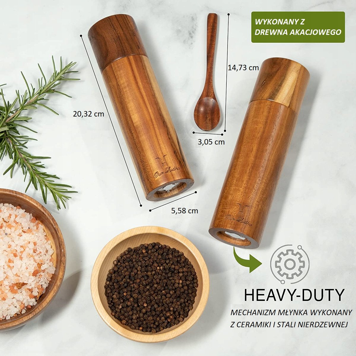 Zestaw młynków ręcznych do soli i pieprzu posiada skuteczny i efektywny ręczny mechanizm rozdrabniający.