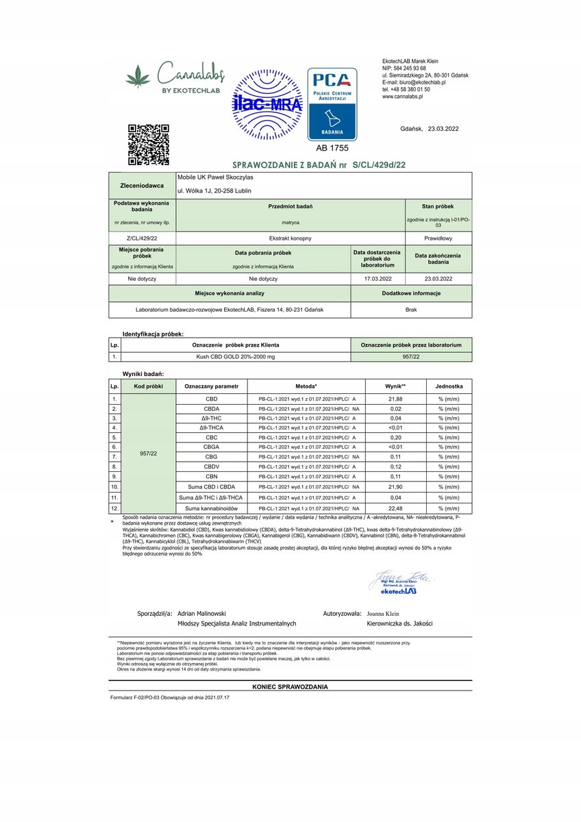Ponieważ kwestie prawne związane z zastosowaniem produktów zawierających w swoim składzie CBD nie zostały jeszcze jednoznacznie doprecyzowane, stosując się do aktualnych przepisów rozporządzenia Parlamentu Europejskiego oraz Rady (UE) Nr 2015/2283 z dnia 25 listopada 2015 r. w sprawie nowej żywności (...) Dz.Urz.UE L 327 z 11.12.2015, str 1.), do czasu rozstrzygnięcia tej kwestii na poziomie UE, jesteśmy zobligowani do poinformowania naszych Klientów o tym, że wszelkie oleje, ekstrakty oraz susze zawierające w swoim składzie związki CBD, aby pozostać w zgodzie z aktualnie obowiązującym prawem mogą być oferowane wyłącznie osobom pełnoletnim do zastosowania zewnętrznego.