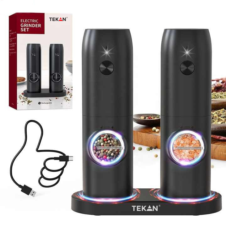Odkryj wygodę i nowoczesny design z elektrycznym zestawem młynków do soli i pieprzu marki TEKAN. Ten stylowy komplet dwóch bezprzewodowych młynków w eleganckim czarnym kolorze to idealne rozwiązanie dla każdego, kto ceni sobie świeżo mielone przyprawy i komfort użytkowania.