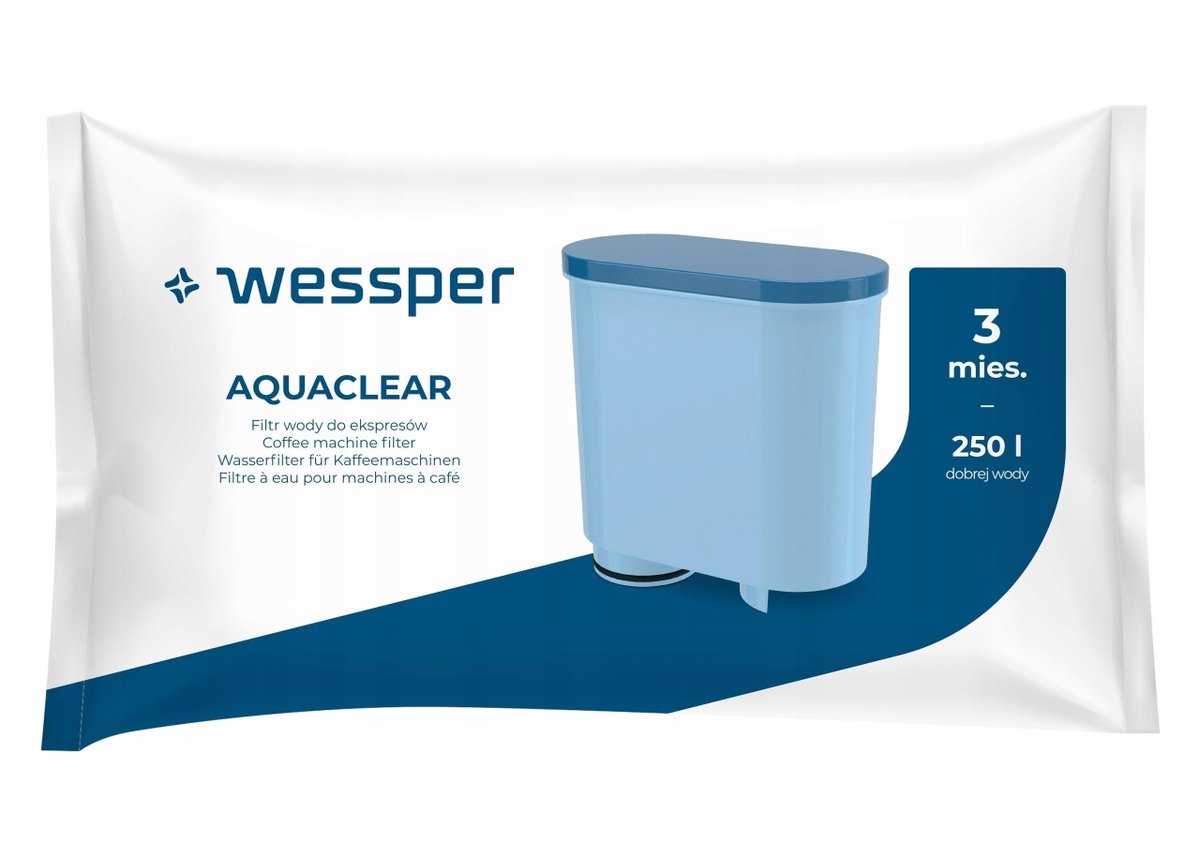 Filtr wody Wessper AquaClear do ekspresów Philips / Saeco oczyszcza wodę z nadmiaru osadów oraz zwiększa żywotność urządzenia.
