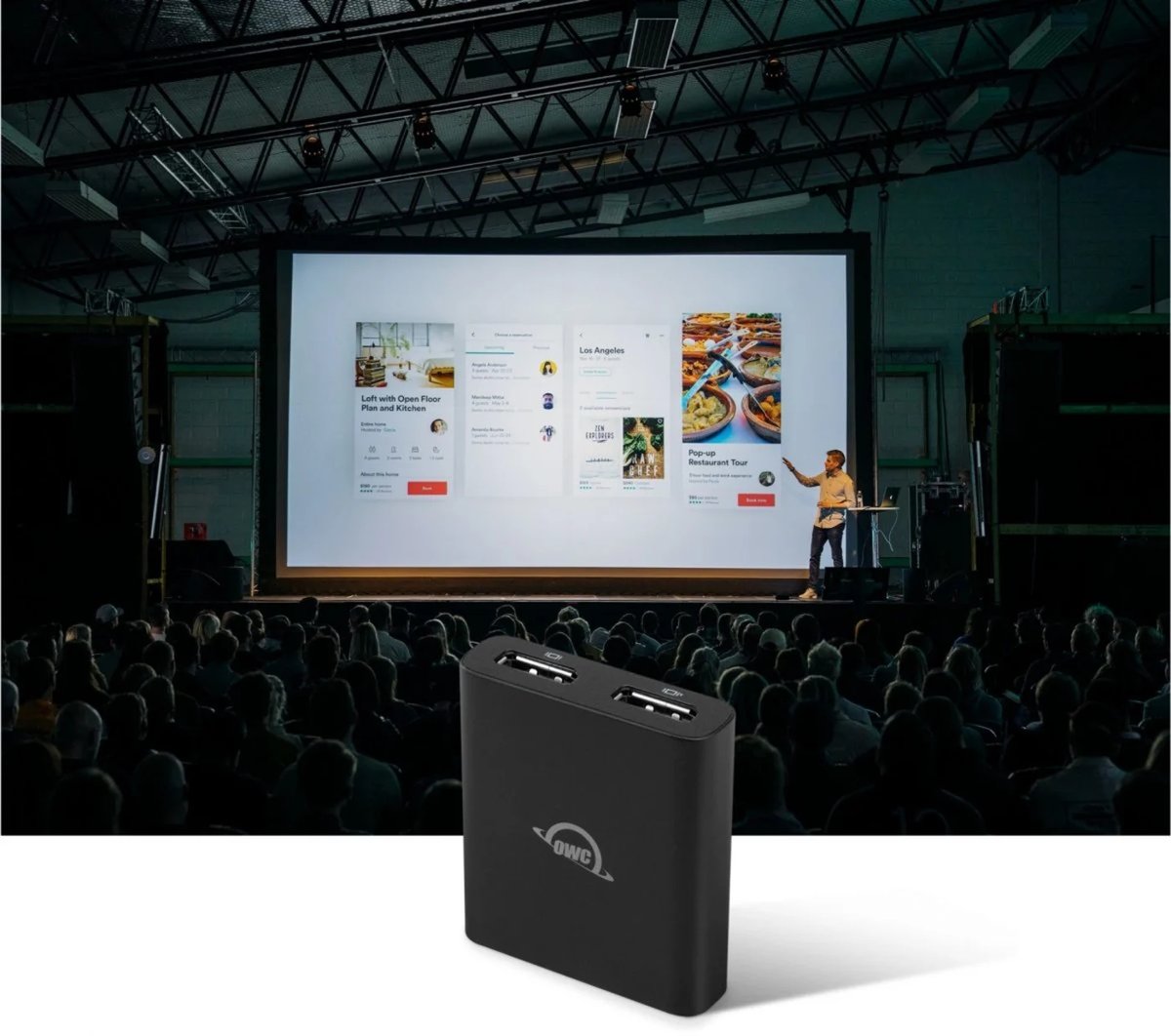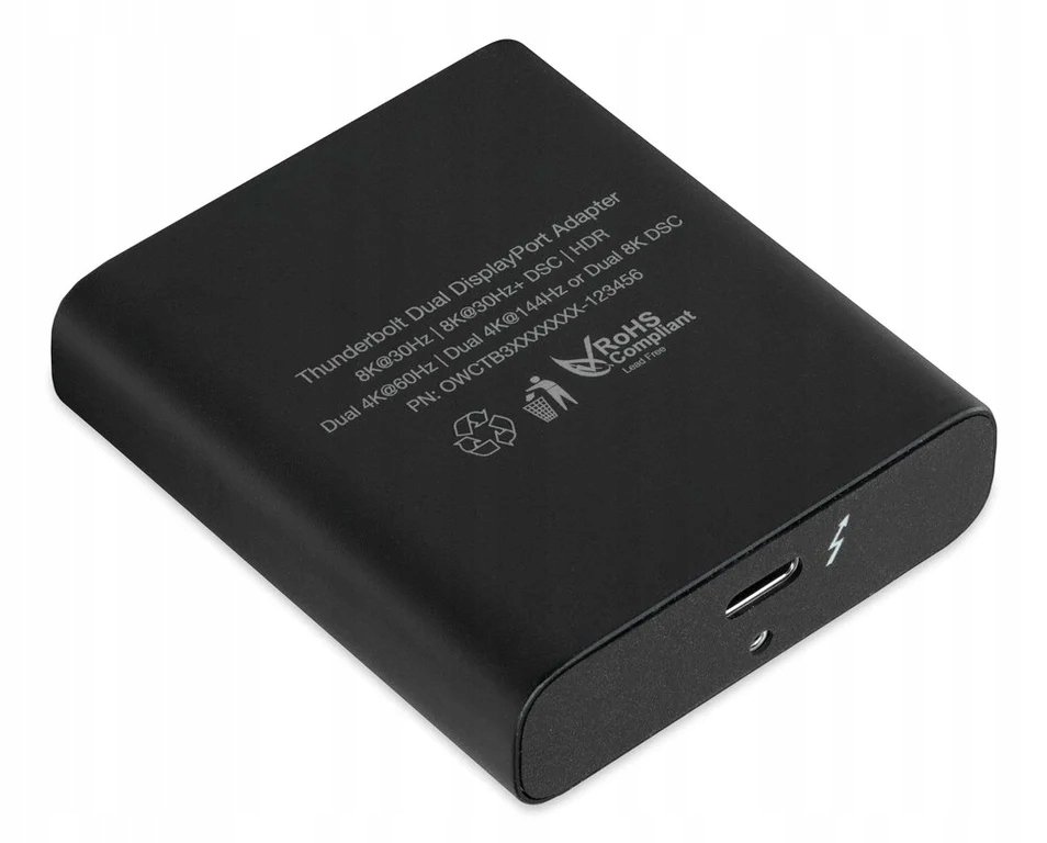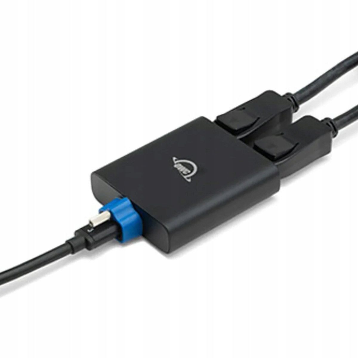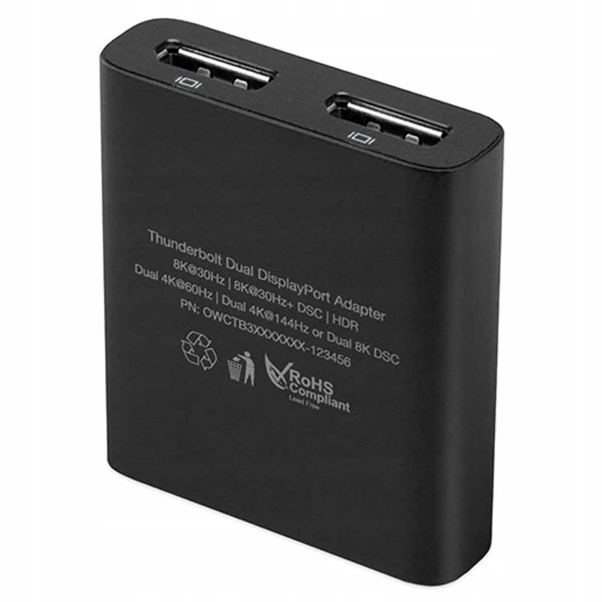 OWC Thunderbolt Dual DisplayPort Adapter. Obsługiwany typ USB: USB Type-C, Rodzaj złącza USB: Żeńska, Maks. rozdzielczość: 7680 x 4320 px. Kolor produktu: Czarny. Obsługiwane systemy operacyjne Windows: Windows 10, Windows 11, Obsługiwane systemy operacyjne Mac: Mac OS X 10.12 Sierra, Mac OS X 10.13 High Sierra, Mac OS X 10.14 Mojave, Mac OS X 10.15 Catalina,.... Szerokość produktu: 56 mm, Głębokość produktu: 63 mm, Wysokość produktu: 16 mm. Przewody: Thunderbolt