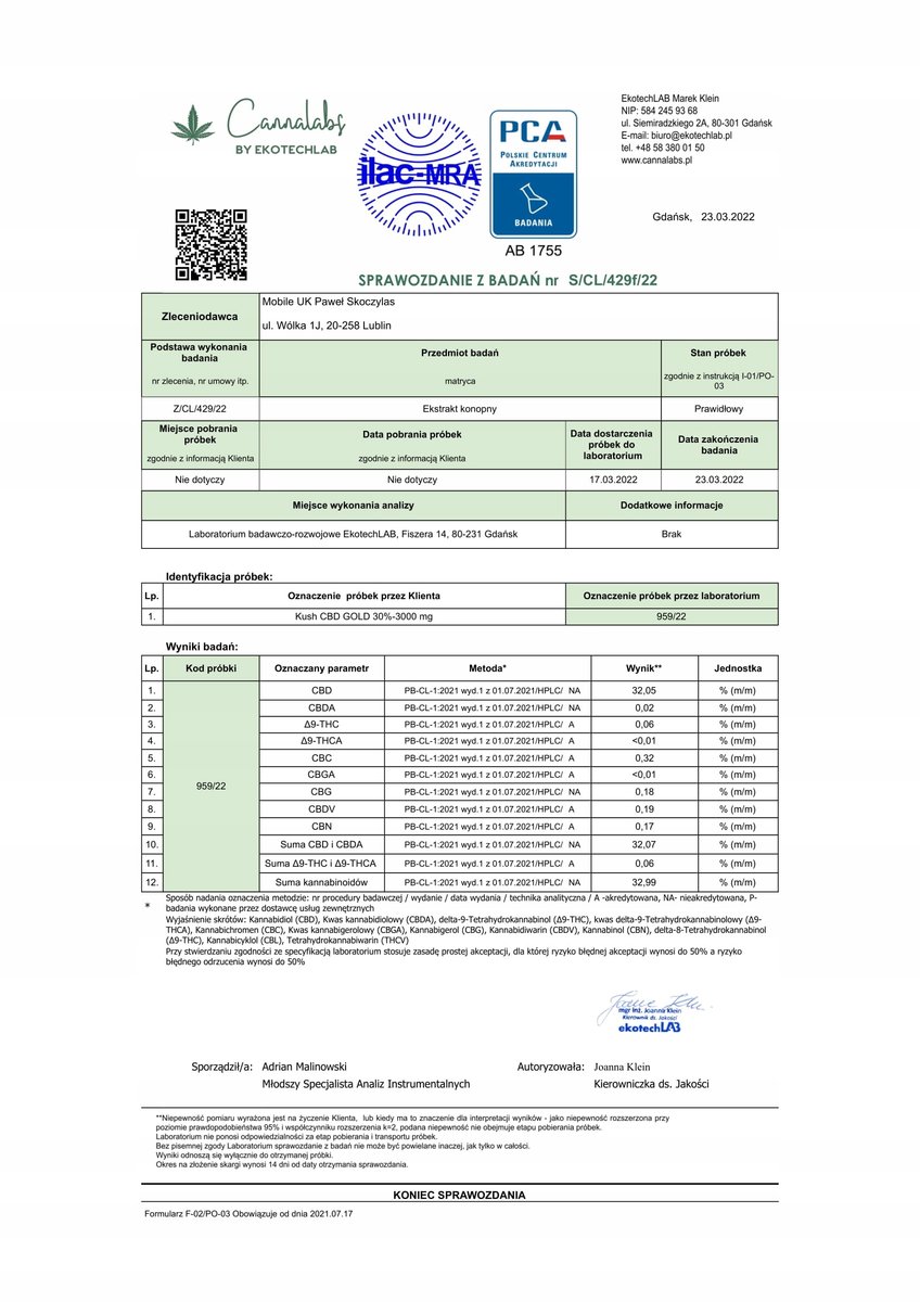Ponieważ kwestie prawne związane z zastosowaniem produktów zawierających w swoim składzie CBD nie zostały jeszcze jednoznacznie doprecyzowane, stosując się do aktualnych przepisów rozporządzenia Parlamentu Europejskiego oraz Rady (UE) Nr 2015/2283 z dnia 25 listopada 2015 r. w sprawie nowej żywności (...) Dz.Urz.UE L 327 z 11.12.2015, str 1.), do czasu rozstrzygnięcia tej kwestii na poziomie UE, jesteśmy zobligowani do poinformowania naszych Klientów o tym, że wszelkie oleje, ekstrakty oraz susze zawierające w swoim składzie związki CBD, aby pozostać w zgodzie z aktualnie obowiązującym prawem mogą być oferowane wyłącznie osobom pełnoletnim do zastosowania zewnętrznego.