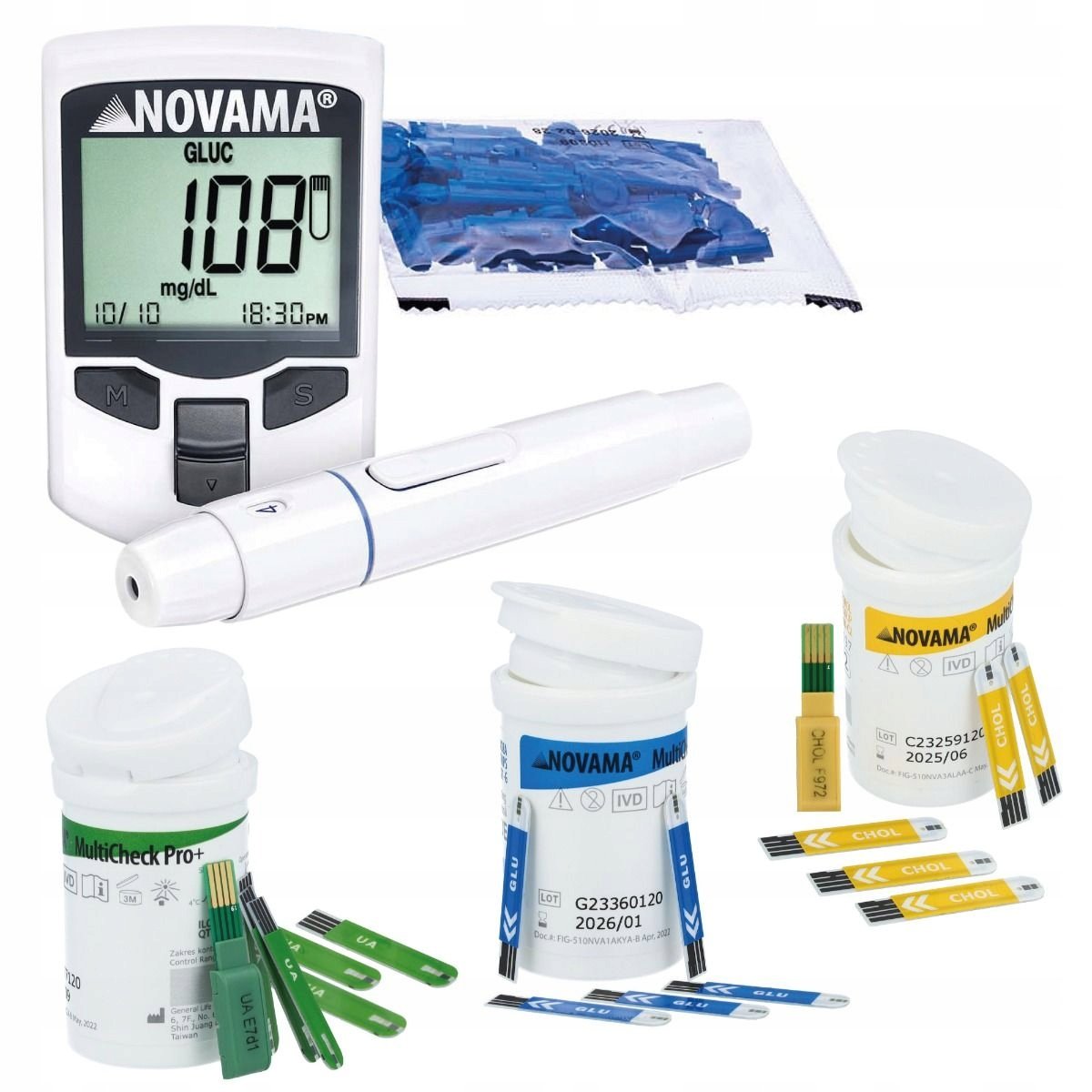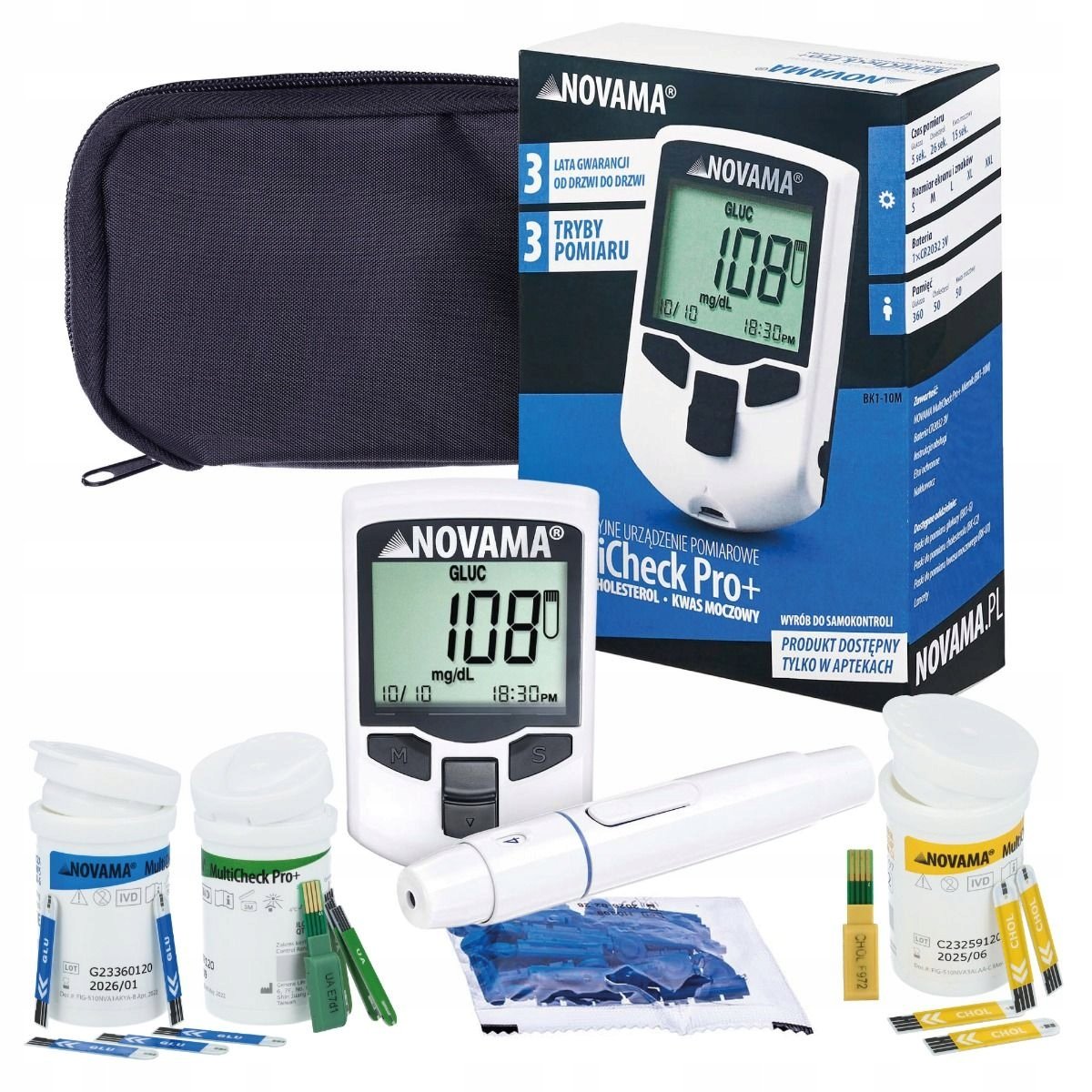 Wielofunkcyjne urządzenie pomiarowe NOVAMA MultiCheck Pro+ paski w zestawie glukoza, cholesterol, kwas moczowy