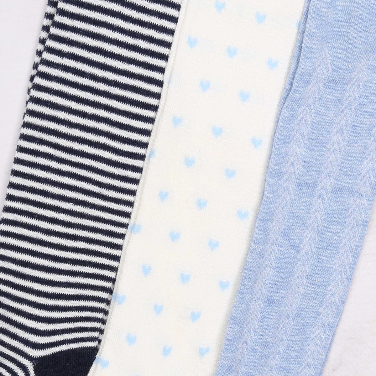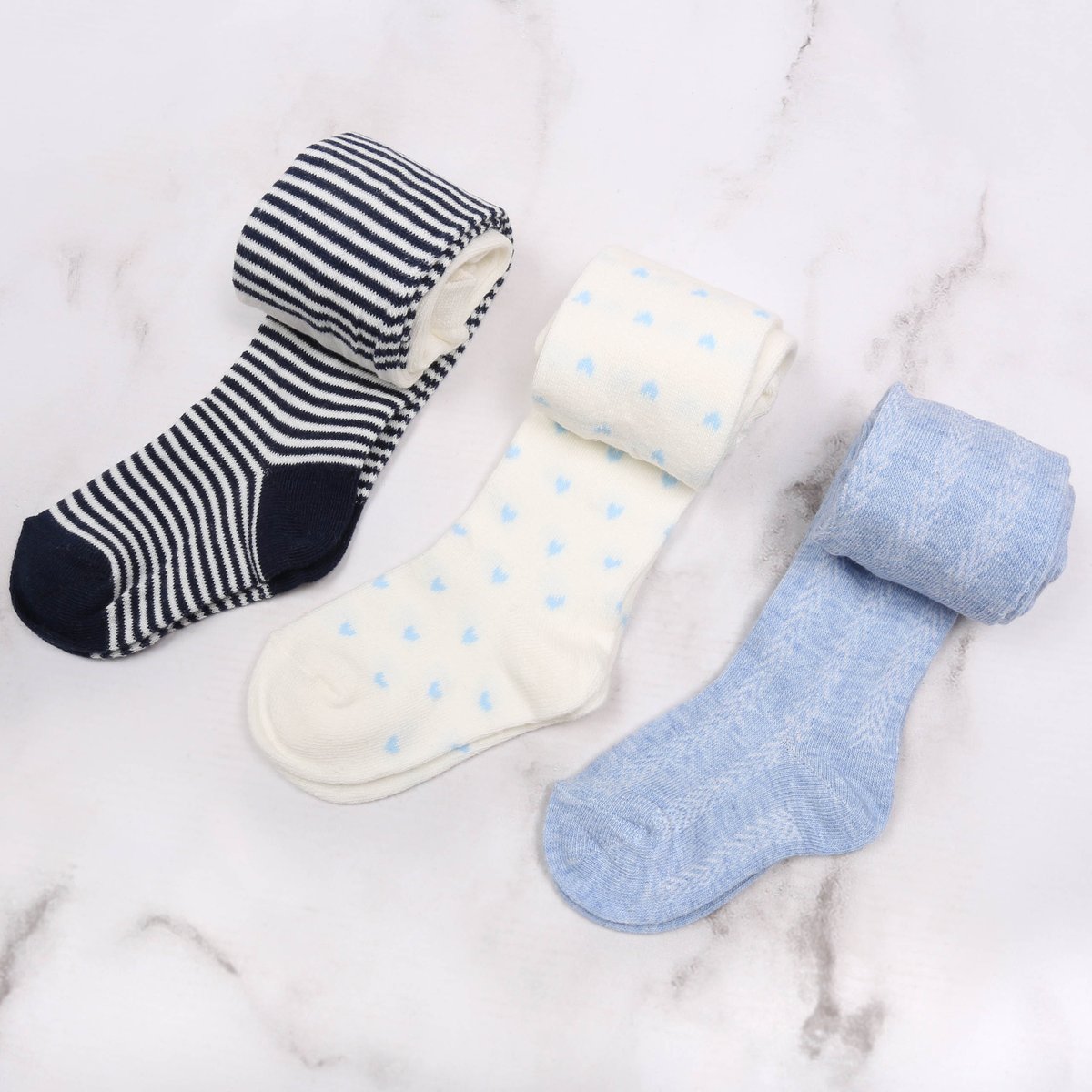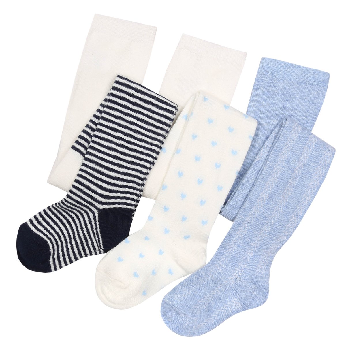 Trzy pary niebiesko-biało-granatowych, dziecięcych rajstop w różne wzory. Rajstopki są bezuciskowe dzięki czemu nie cisną w okolicach brzucha. Wykonane z delikatnego i miękkiego w dotyku materiału ...