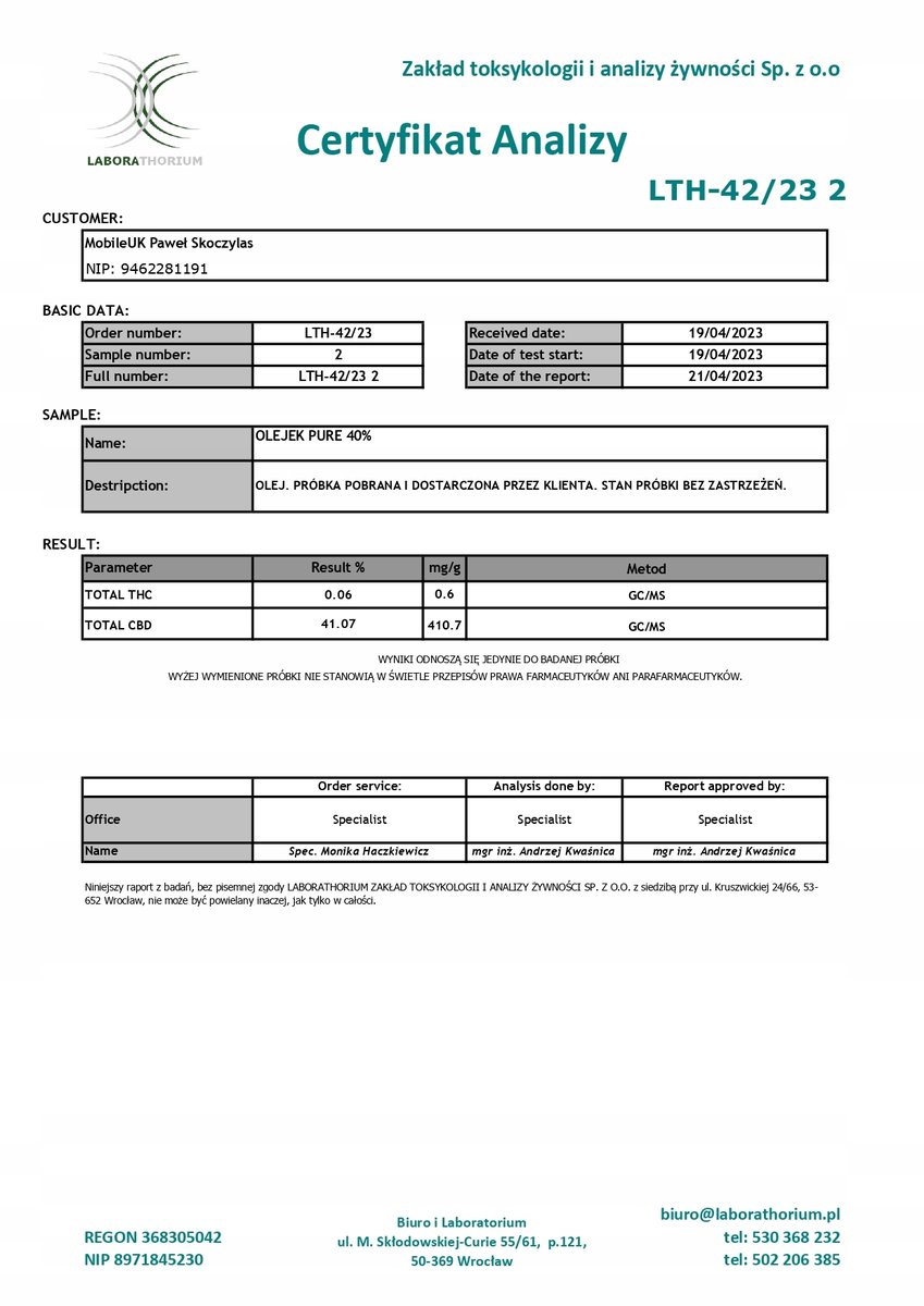 Właśnie zrecenzowałem 40% olejek KONOPNY CBD | PURE | Izolat CBD | THC FREE | 2 x 10ml