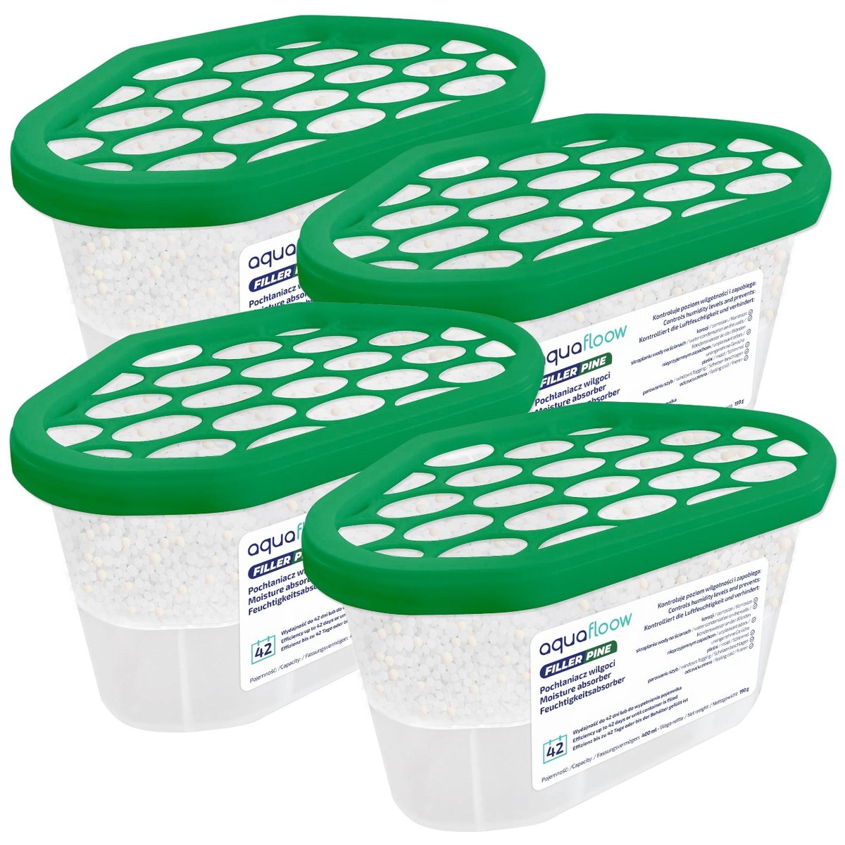 Pochłaniacz wilgoci AquaFloow Refiller 400 ml - zapach sosny - 4 sztuki Pochłaniacz wilgoci Aquafloow o pojemności 400 ml skutecznie radzi sobie z nadmierną wilgotnością w domu. Idealny do szaf, ...
