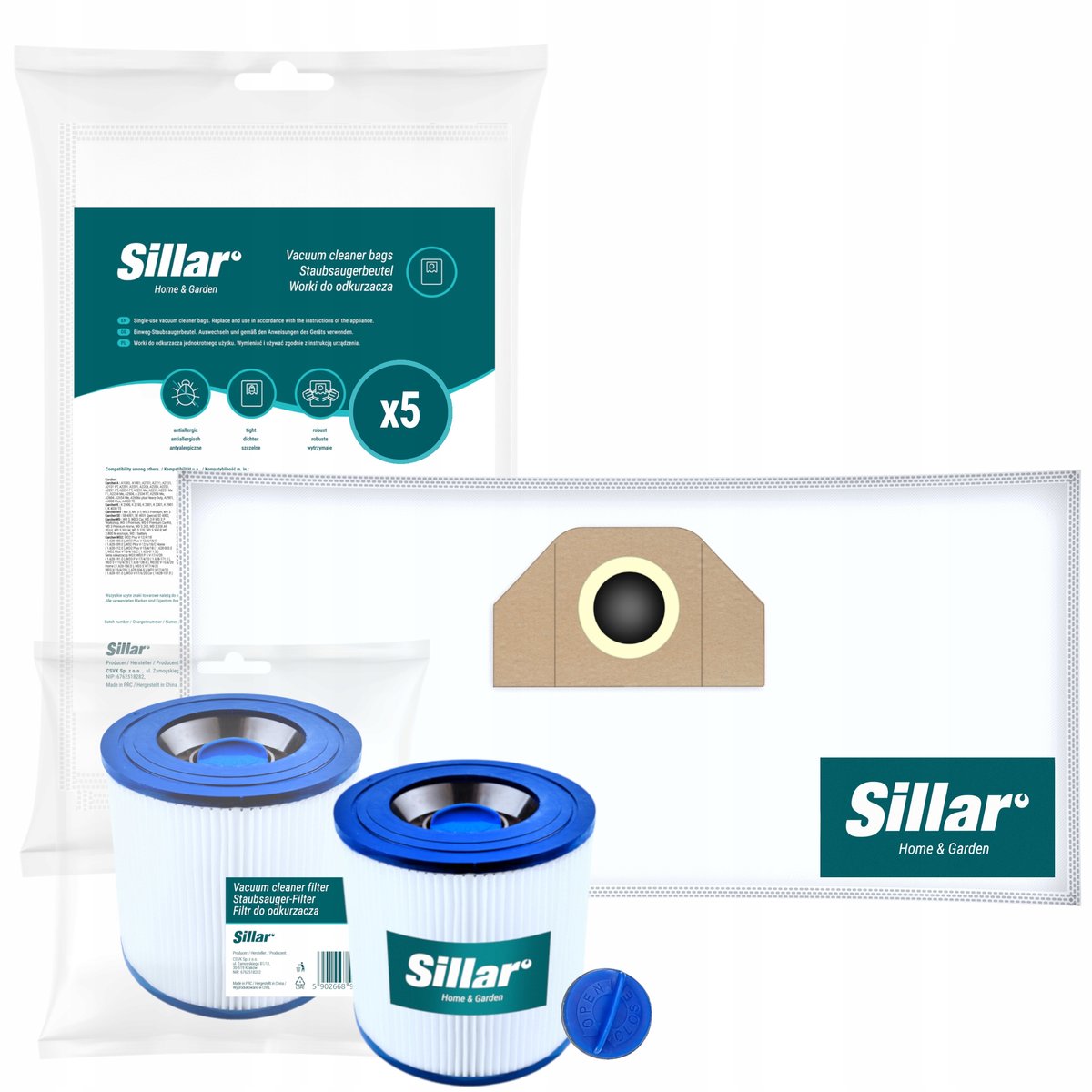 ZESTAW SILLAR: 5x WORKI SYNTETYCZNE SIL1017 + 1x FILTR ZMYWALNY SIL1225 WRAZ Z KORKIEM DO ODKURZACZY KARCHER