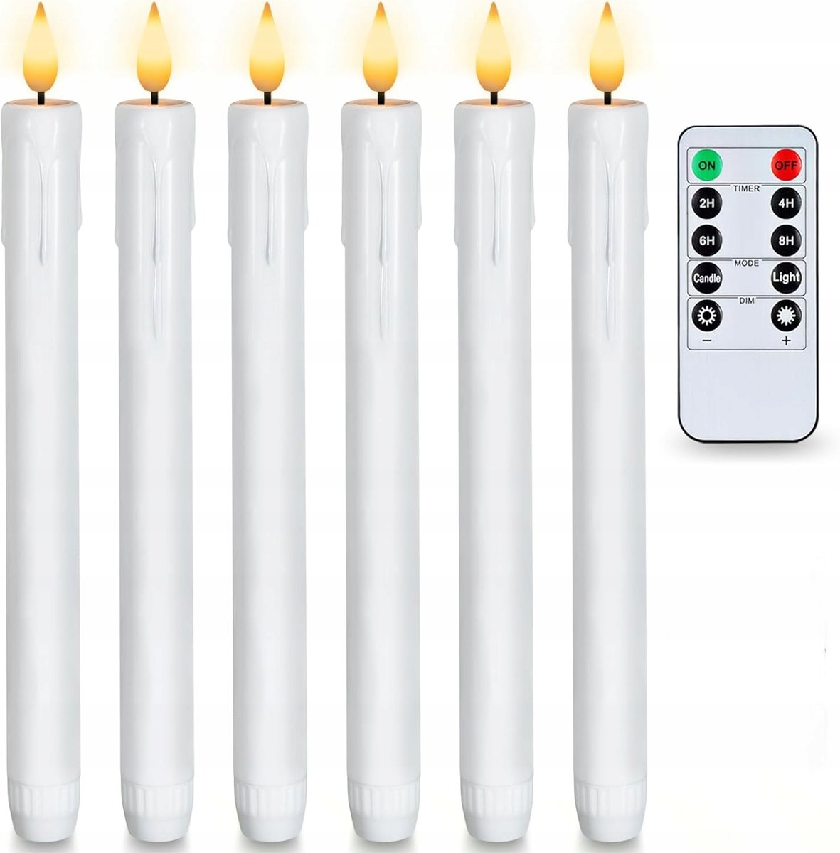 Pilot zdalnego sterowania i timer - świece LED z pilotem zdalnego sterowania (1). 2 tryby świecenia, migotanie lub normalne świecenie. (2). Funkcja timera 2-4-6-8-godzinnego włącza się każdego dnia o tej samej porze. (3) Stwórz najcieplejszy efekt świetlny poprzez proste dostosowanie jasności oświetlenia.