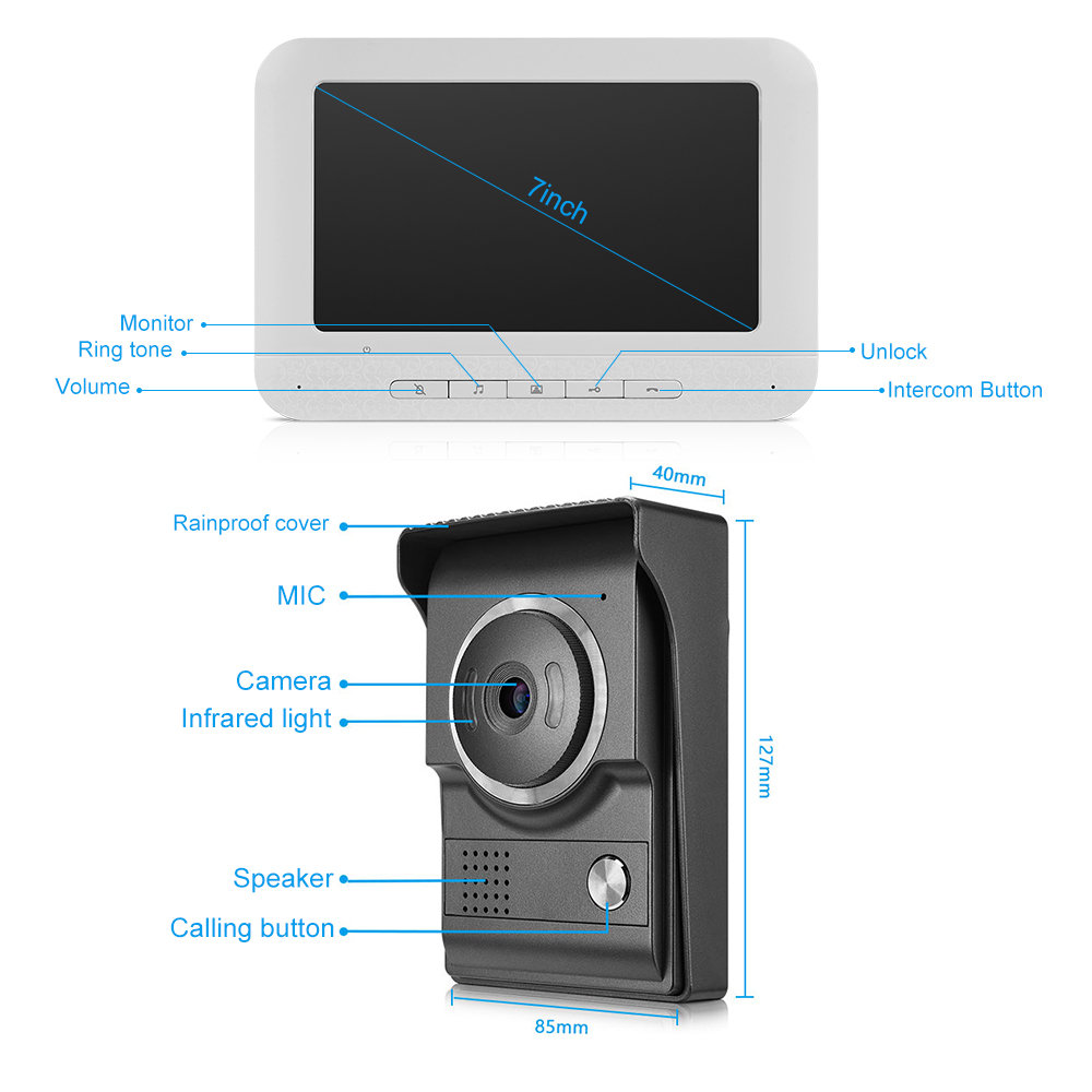 | Nazwa: | 7-calowy wideodomofon z dzwonkiem do drzwi, kolorowym ekranem TFT-LCD, 1 monitorem wewnętrznym, 1 kamerą zewnętrzną, obsługą noktowizora, wodoodpornym monitorem odblokowującym do domu |