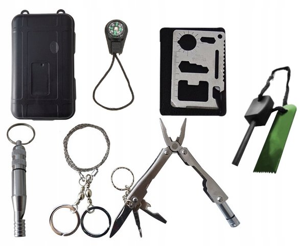 Zestaw jest przydatny głównie podczas podróży, wypraw; niezbędnik każdego survivalowca i miłośnika pieszych wypraw. Całość zamykana jest w wodoszczelnym etui zamykanym na 4 zatrzaski, wewnątrz wypełniony został miękką wyściółką. Etui jest kompaktowe, więc nie zajmie dużo miejsca w plecaku, dodatkowo posiada na górze 2 otwory, które umożliwiają zawieszenie np. przy użyciu sznurka na szyi.