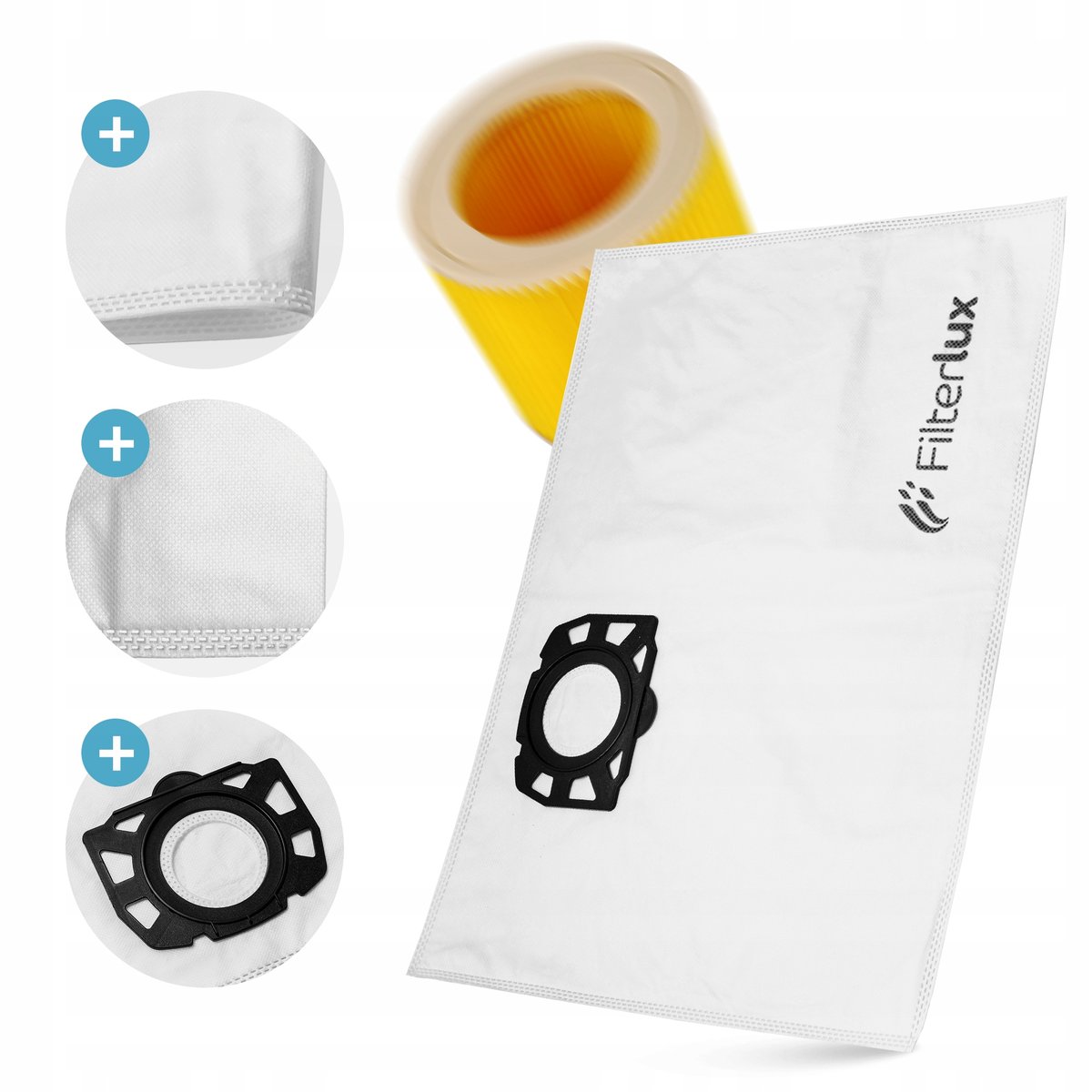 Worki Filterlux stanowią zamiennik worków o numerze 2.863-314.0, a filtr odpowiada modelowi 6.414-552.0. W zestawie znajduje się również zamek mocujący do pewnego mocowania filtra. Oba elementy zestawu są kompatybilne z odkurzaczami Karcher z serii: