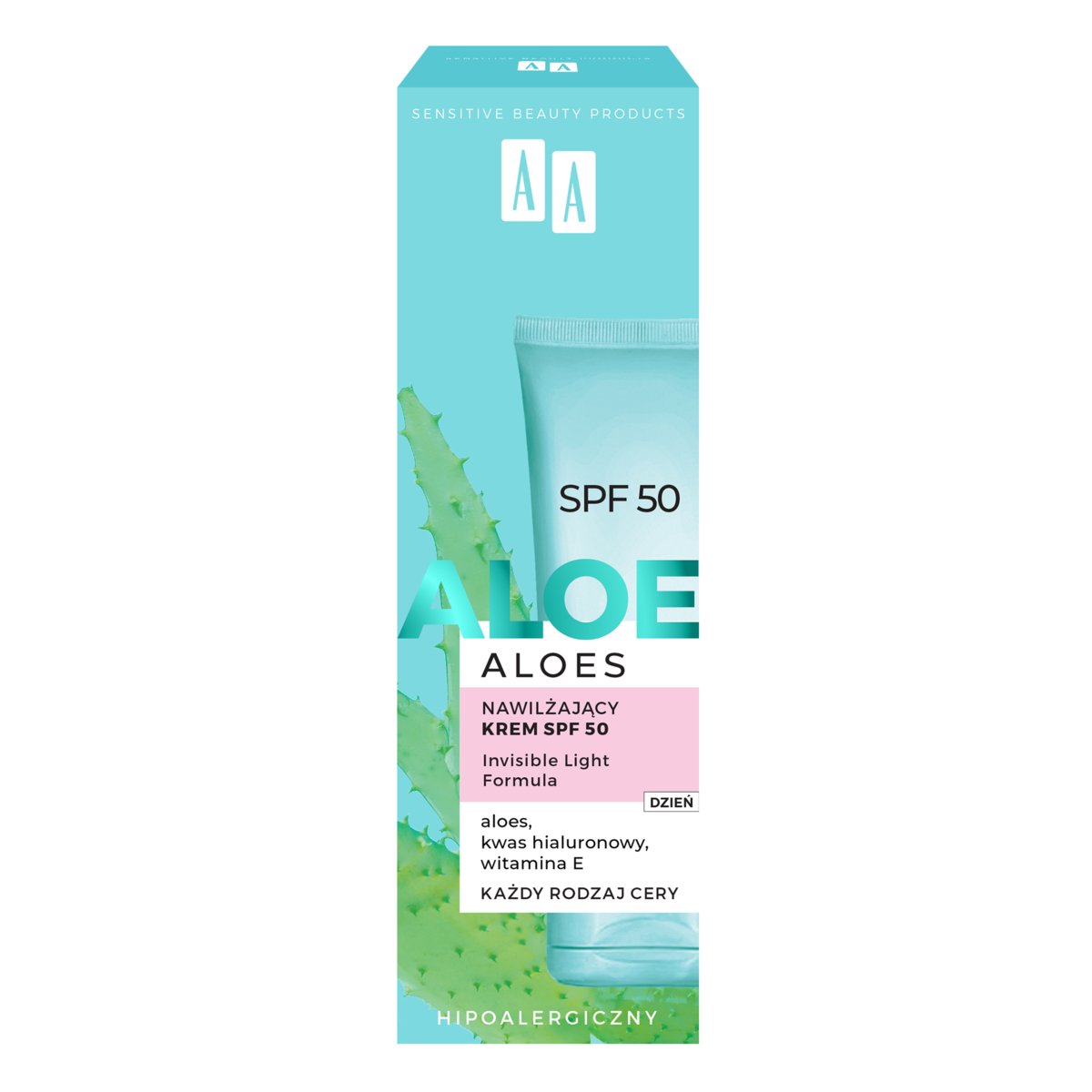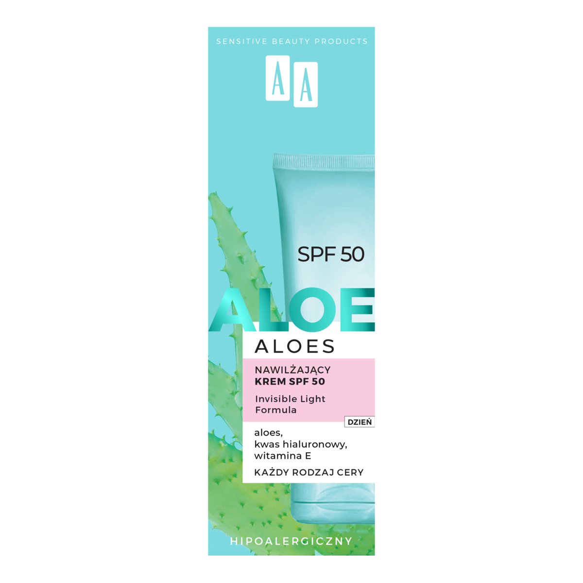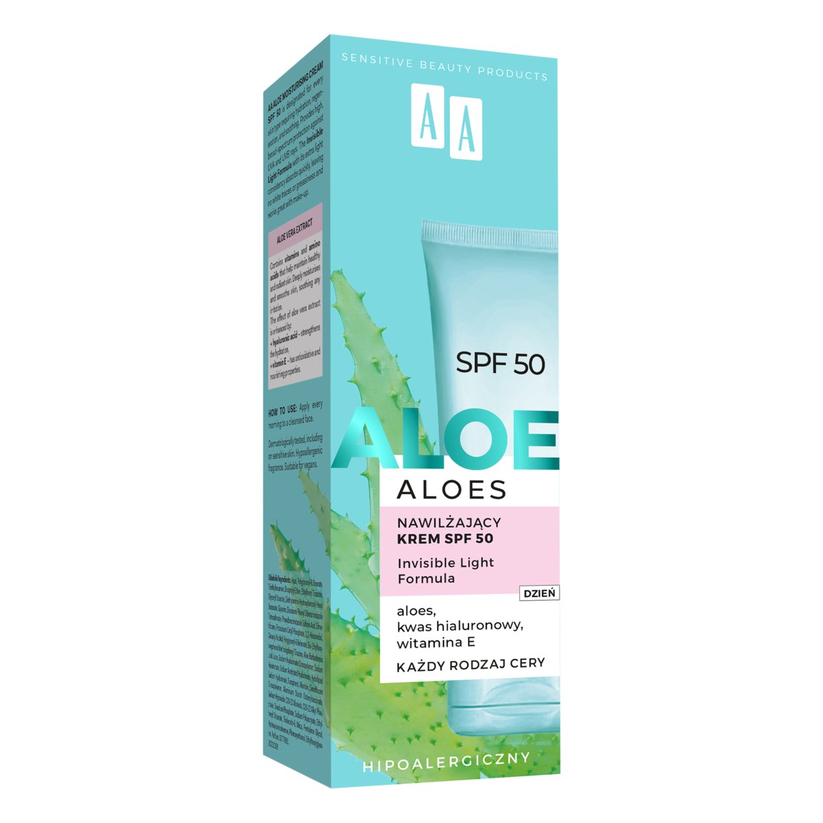 AA ALOES to multinawilżający program pielęgnacji każdego typu skóry, a zwłaszcza odwodnionej i wrażliwej, wymagającej ukojenia i regeneracji. KREM NAWILŻAJĄCY SPF 50 jest przeznaczony dla każdego typu cery odwodnionej, wymagającej regeneracji i ukojenia. Zapewnia wysokiej jakości ochronę przed promieniowaniem UVA/UVB o szerokim spektrum działania. Invisible Light Formula o superlekkiej konsystencji błyskawicznie się wchłania, bez efektu bielenia i uczucia tłustej skóry, a także doskonale współpracuje z makijażem. Ekstrakt z aloesu intensywnie nawilża, wygładza i łagodzi podrażnienia. Kwas hialuronowy potęguje działanie nawadniające, a witamina E działa antyoksydacyjnie i odżywczo.
