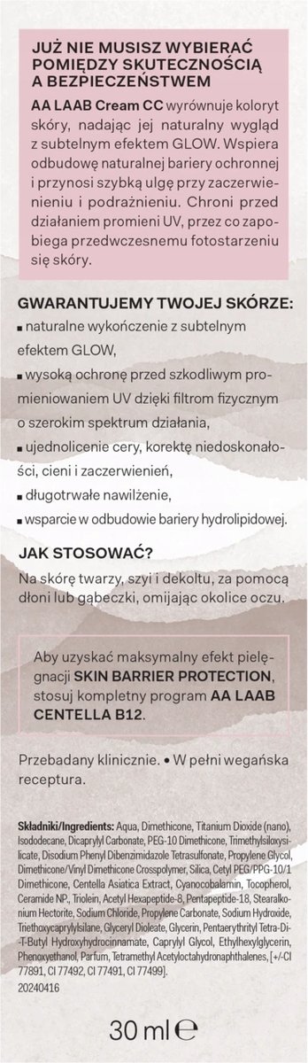 | Nazwa: | AA LAAB 100% Centella B12 Krem CC korygujący SPF50 nr 01 Light |
