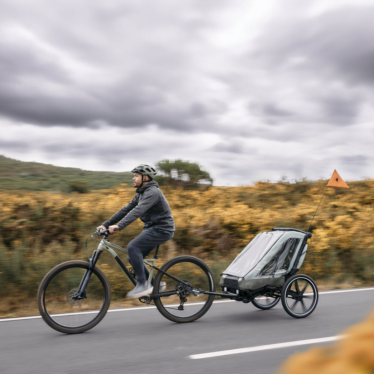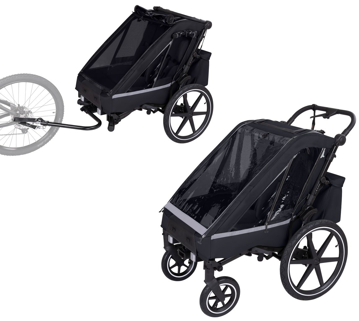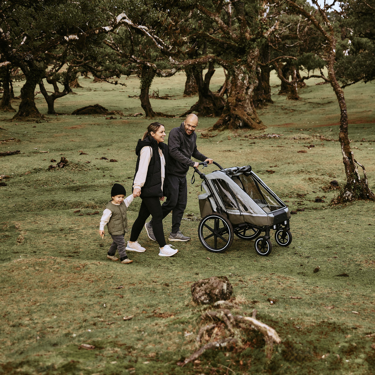 Dzięki swojej multifunkcjonalności przyczepka Tour w mgnieniu oka może zmienić się z solidnego wózka spacerowego w wózek biegowy z dużymi pompowanymi kołami lub w stabilną przyczepkę rowerową.