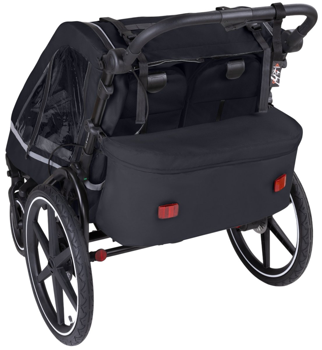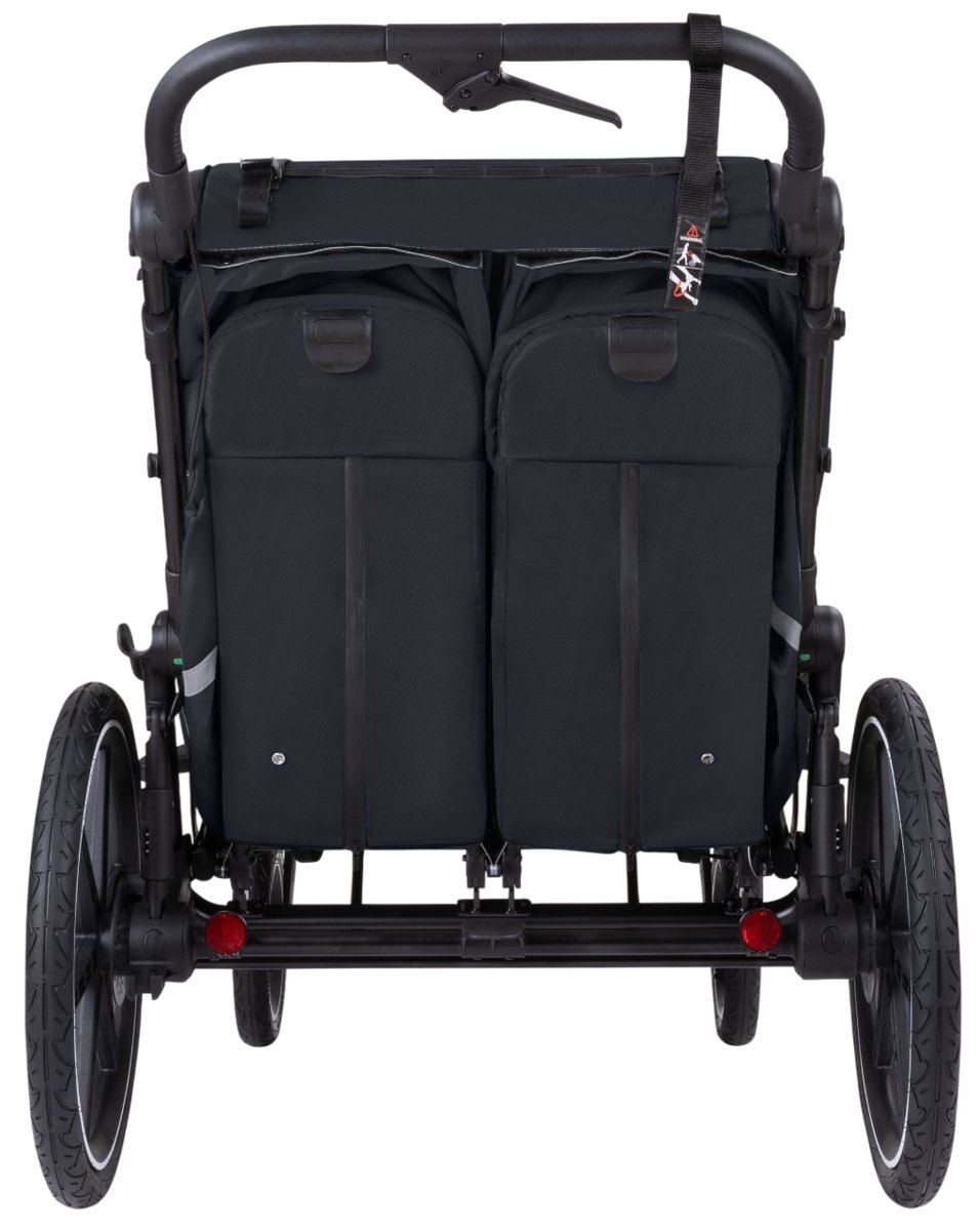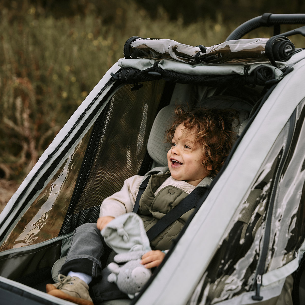 Dzięki swojej multifunkcjonalności przyczepka Tour w mgnieniu oka może zmienić się z solidnego wózka spacerowego w wózek biegowy z dużymi pompowanymi kołami lub w stabilną przyczepkę rowerową.