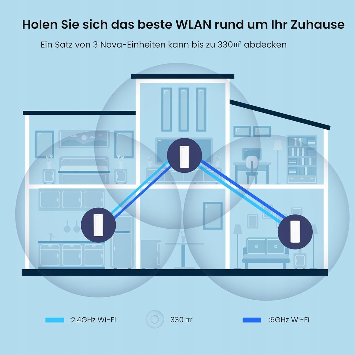 - Sieć domowa WLAN kompletne rozwiązanie: idealne jako zamiennik dla tradycyjnych przedłużaczy Wi-Fi lub routerów Wi-Fi. MX12 zapewnia zasięg Wi-Fi do 330 m² (1 opakowanie: 110 ㎡ # 2-pak: 220㎡ # 3-pak: 330㎡) jako kompletne rozwiązanie Wi-Fi z szybką i stabilną siecią Wi-Fi. Wyeliminuj wszystkie obszary bez odbioru Wi-Fi