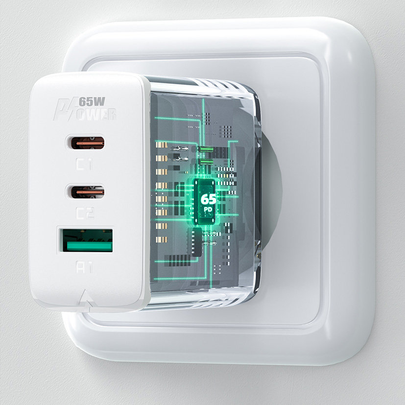Szybka ładowarka sieciowa marki Acefast. Posiada 2 porty USB Typ C i USB. Kiedy do ładowarki podłączone jest tylko 1 urządzenie, pierwsza wtyczka USB Typ C oznaczona jako "C1" umożliwia ładowanie z maksymalną mocą 65W, wtyczka "C2" z mocą do 20W, a wtyczka USB do 18W. Za pomocą portu "C1" można zasilać notebooki, które do pracy wymagają mocy o wartości do 65W (sprawdź specyfikację swojego komputera). Pozwala na szybkie ładowanie trzech urządzeń jednocześnie m.in. w standardach PPS, Power Delivery, Quick Charge 3.0, AFC i FCP. Jest wykonana z ognioodpornego materiału PC. Została wyposażona w wiele zabezpieczeń takich jak np. przed przegrzaniem, przepięciem, wysokim napięciem czy przeciążeniem. W zestawie z ładowarką znajduje się kabel USB Typ C - USB Typ C.