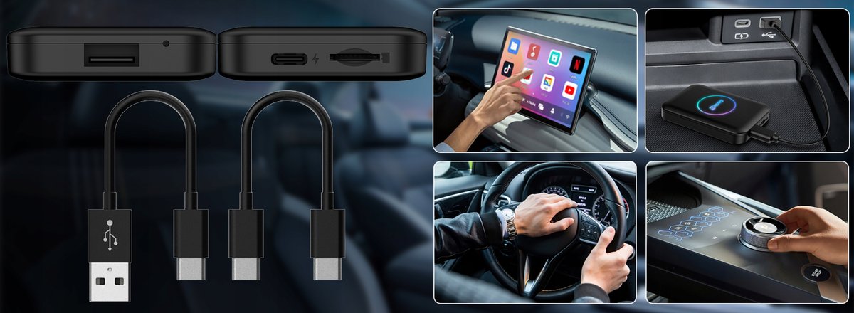Bezprzewodowy adapter samochodowy dla Androida Auto i CarPlay. Pozwala na konwersje przewodowego Android Auto lub CarPlay na bezprzewodowy. Płynne przełączanie funkcji telefonu na ekran samochodu. Łatwe odtwarzanie muzyki, nawigacja, obsługuje również sterowanie głosowe, Siri, asystenta Google itp.