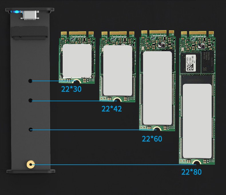 - Obsługiwane moduły: dyski z kluczem „B key” i „B+M key” o długościach (2230, 2242, 2260, 2280).