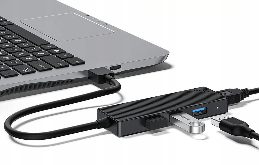 - Hub umożliwia rozszerzenie jednego portu USB 3.0 na cztery dodatkowe porty, umożliwiając podłączenie wielu urządzeń USB-A jednocześnie, takich jak pendrive'y, myszy, klawiatury, głośniki i kontrolery do gier.