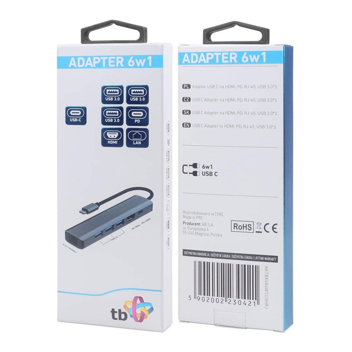Adapter HUB USB C 6w1 - HDMI, USBx3, PD, RJ-45