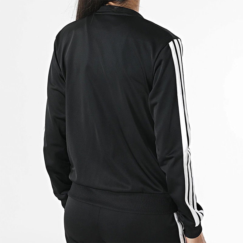 100% poliester śliski materiał kolor czarny sportowy, oldskoolowy model bluza: bez kaptura dekolt stójka zapinana na zamek dwie boczne kieszenie niezapinane wyszywane logo Adidas na piersi spodnie: z