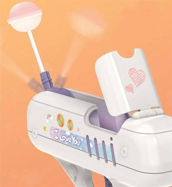 Wspaniała zabawka dla dzieci. Pistolet niespodzianka na lizaki. Po wciśnięciu spustu spod klapki w górnej części zabawki wystrzeliwuje lizak. Zabawka jest bardzo prosta w obsłudze, a do jej zasilenia