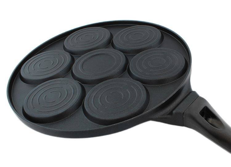 Solidna patelnia do jajek i naleśników. Umożliwia jednoczesne smażenie aż do 7 jajek lub pancacke'ów! Wykonana z trwałej powłoki marmurkowej (nieprzywierającej) oraz aluminiowego spodu. Wyposażona w długą i nienagrzewającą się rączkę z możliwością zawieszenia na ścianie. Dostosowana zarówno do klasycznych kuchenek gazowych jak również płyt indukcyjnych!