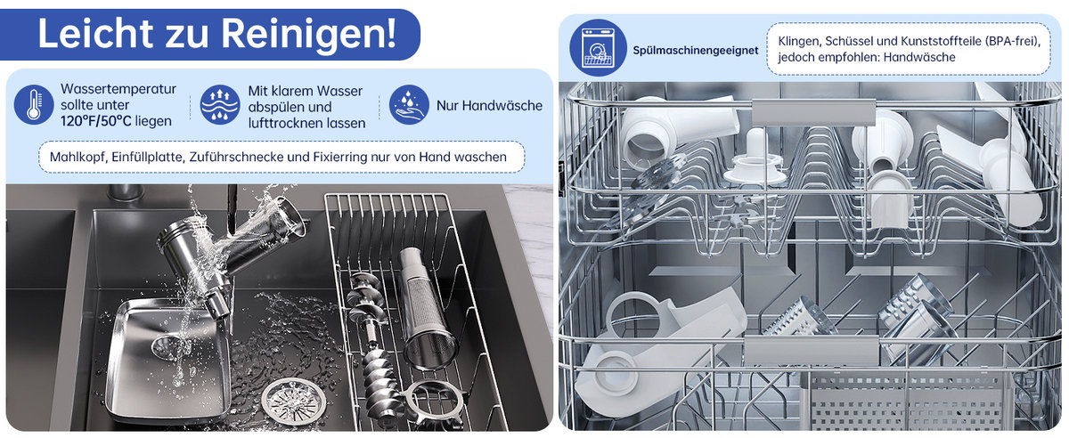 Higieniczna i łatwa w czyszczeniu: ta maszynka do mięsa ze stali nierdzewnej jest higieniczna i łatwa w czyszczeniu. Części aluminiowe, takie jak głowica maszynki do mięsa, tacka do napełniania, podajnik ślimakowy i pierścień montażowy, należy myć ręcznie. Części ze stali nierdzewnej, takie jak ostrza, tarcze i nakładki do tarcia, a także części plastikowe można myć w zmywarce, jednak zaleca się mycie ręczne w celu przedłużenia żywotności.