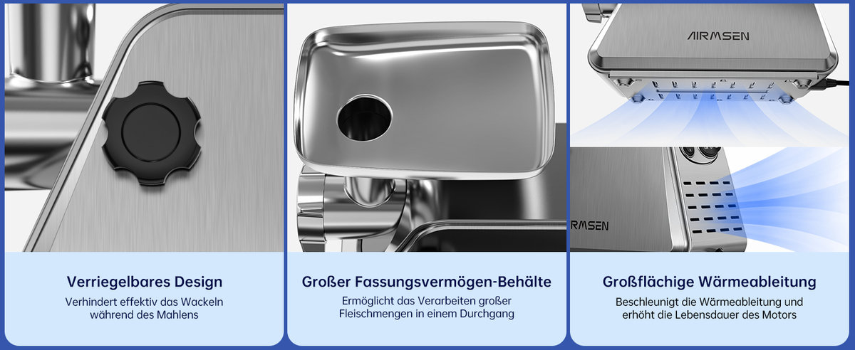 MOCNA I WYDAJNA Elektryczna maszynka do mielenia mięsa AIRMSEN zapewnia wysoką wydajność i wykorzystuje 100% czystej miedzi, aby zapewnić szybkie i wydajne rozdrabnianie. Osiąga prędkość przetwarzania 2 kg na minutę (w zależności od sposobu użytkowania). Ta domowa maszynka do mielenia mięsa z łatwością radzi sobie nawet z twardymi kawałkami mięsa i warzyw, znacznie skracając czas gotowania. Idealna dla miłośników mięsa i domowych kucharzy.