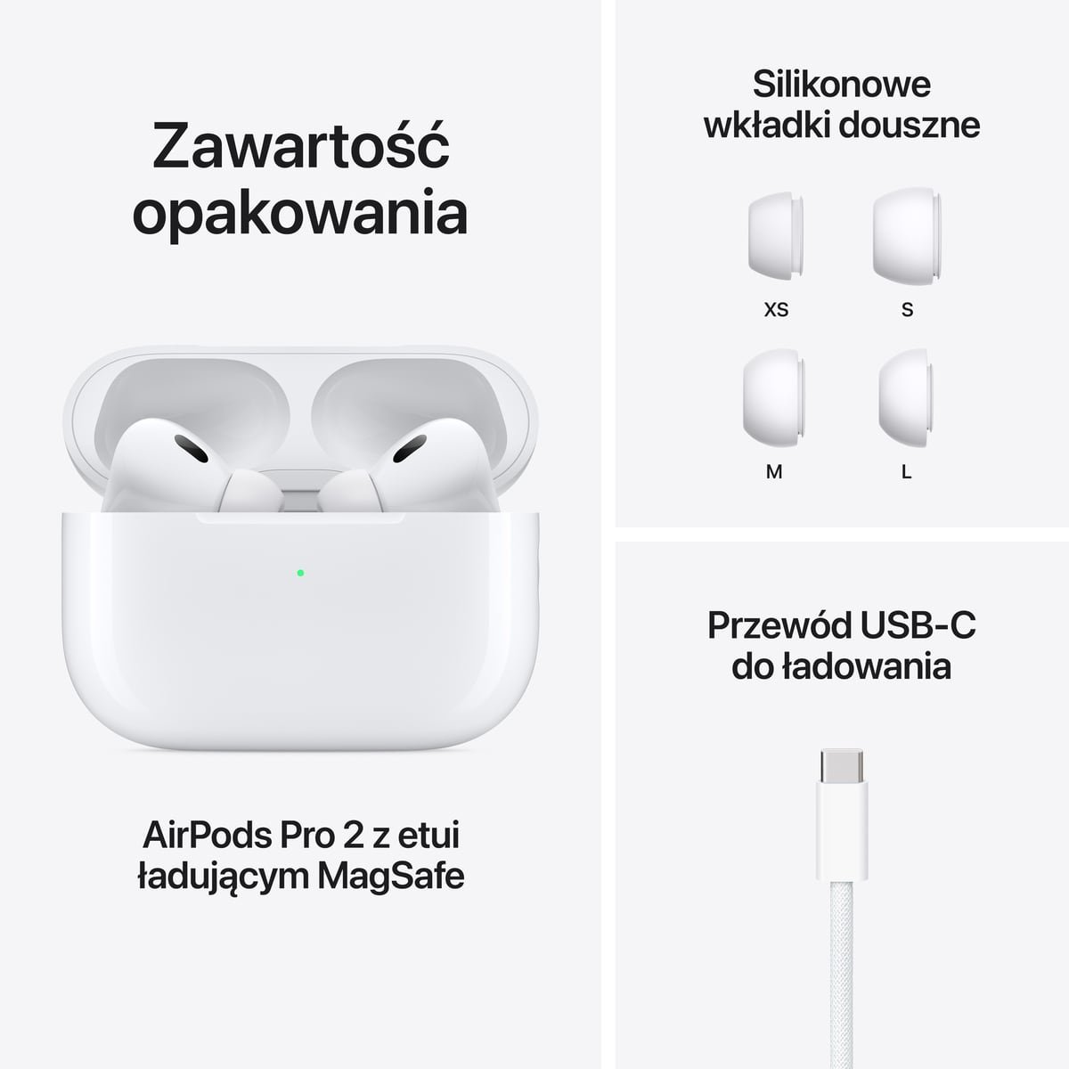 Zawartość zestawu: AirPods Pro, Etui ładujące MagSafe (USB-C) z głośnikiem i uchwytem na smycz, silikonowe wkładki douszne (w czterech rozmiarach XS, S, M, L), przewód USB-C do ładowania, dokumentacja