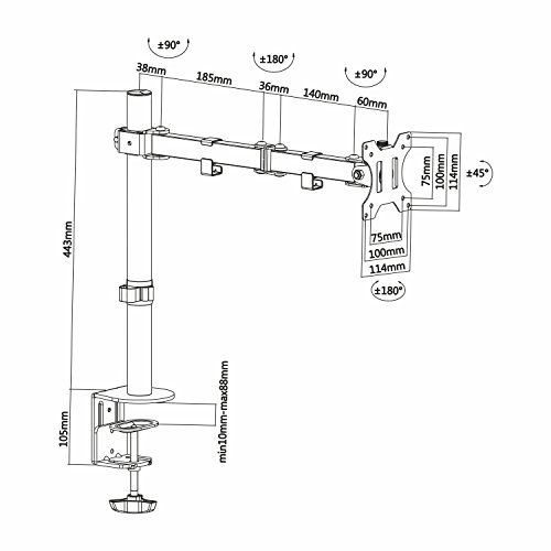 aisens dt32tsr-039 Uchwyt stołowy do monitora/telewizora od 13"-32, Czarny 'Eco, obrotowy/uchylny stojak stołowy do monitora/telewizora (3 piny, 1 ramię) 13"-32 wykonany ze stali o wysokiej wytrzymałości i malowany proszkowo doskonałe wykończenie. Umożliwia montaż zacisku śrubowego na stole przez lub przelotowo Maksymalny VESA: 100 x 100 mm (kompatybilny z VESA 75 x 75, 100 x 100 mm) – Maksymalne obciążenie: 8 kg Maksymalny kąt pochylenia: -45°/+ 45° obrót: 360° (w zależności od instalacji i dostępnej przestrzeni), maksymalny kąt obrotu: 180° System zarządzania kablami: posiada kilka haczyków do grupowania kabli.