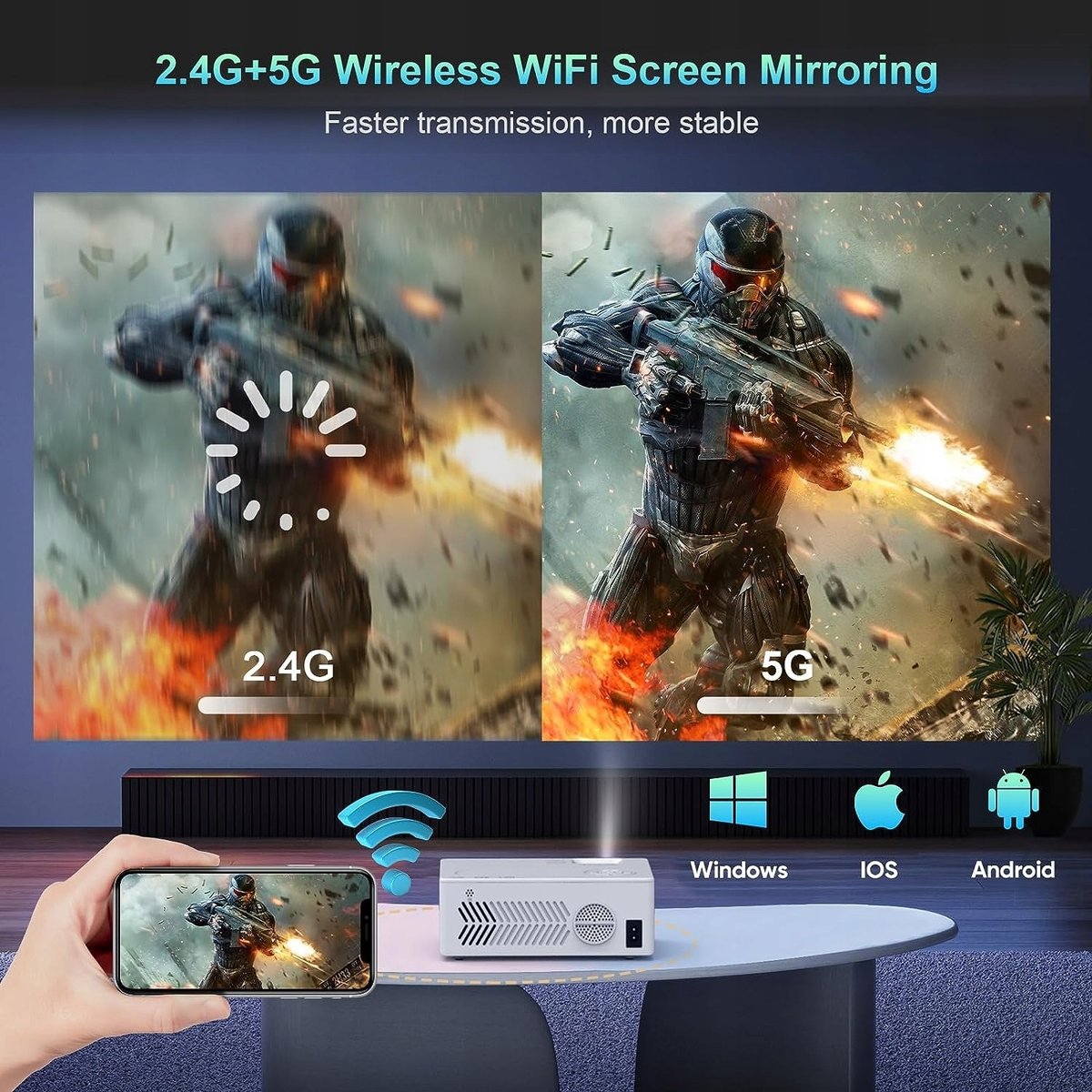 【Zaawansowane połączenie Wi-Fi 5G w 5 sekund】 Wyposażony w najnowszą dwupasmową sieć Wi-Fi 5G/2,4G, projektor może połączyć się z Twoimi urządzeniami w ciągu 5 sekund bezpośrednio przez domową sieć Wi-Fi bez opóźnień audio lub wideo.