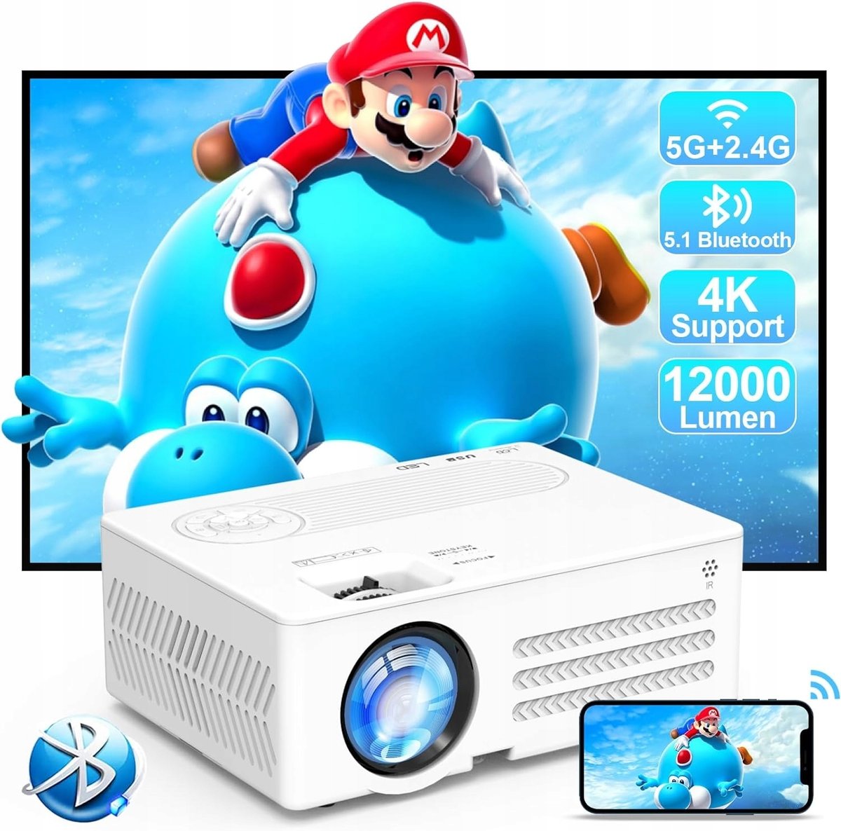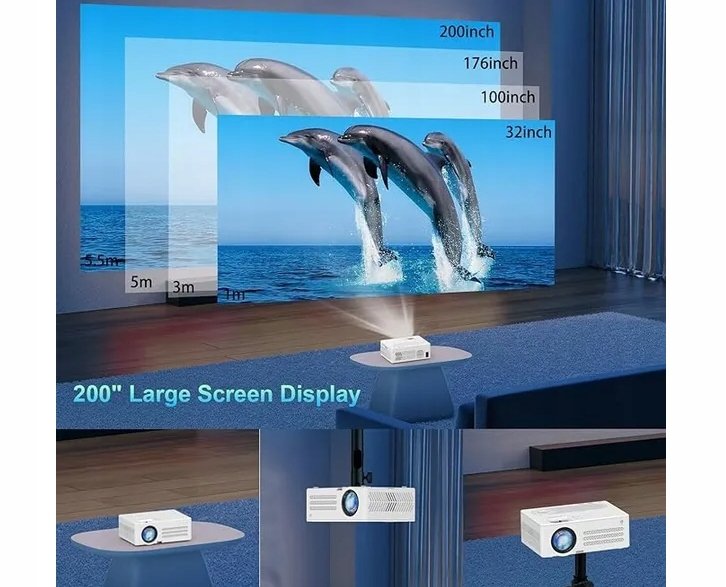 Prawdziwy projektor WiFi 1080P 5G - aby sprostać potrzebom naszych klientów, nowy model został zaktualizowany do natywnej rozdzielczości 1080p (1920 x 1080p), 5G i 2,4G, jasności 12000 lumenów. Dzięki natywnej rozdzielczości 1080p, 4K, 12000 lumenów i współczynnikowi kontrastu 10000: 1, produkt zapewnia żywy i kolorowy obraz i zapewnia prawdziwe wrażenia kinowe, zarówno do oglądania filmów w domu lub wieczornych zajęć z rodziną lub przyjaciółmi.