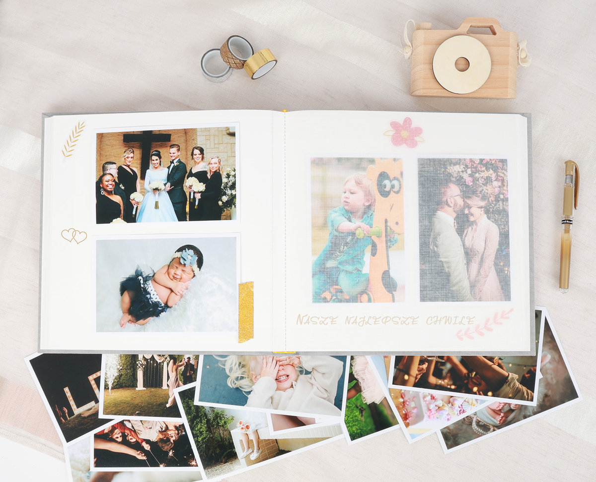 Najważniejsza jest Twoja kreatywność – wybierz jeden z naszych minimalistycznych, stylowych szablonów nadruku, który idealnie odda charakter albumu, lub skorzystaj z opcji pełnej personalizacji, aby wprowadzić własne zmiany. Dzięki temu album stanie się jedyny w swoim rodzaju.