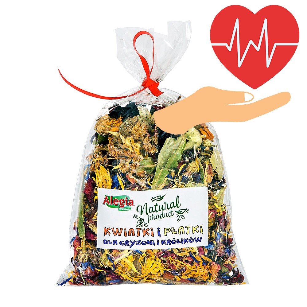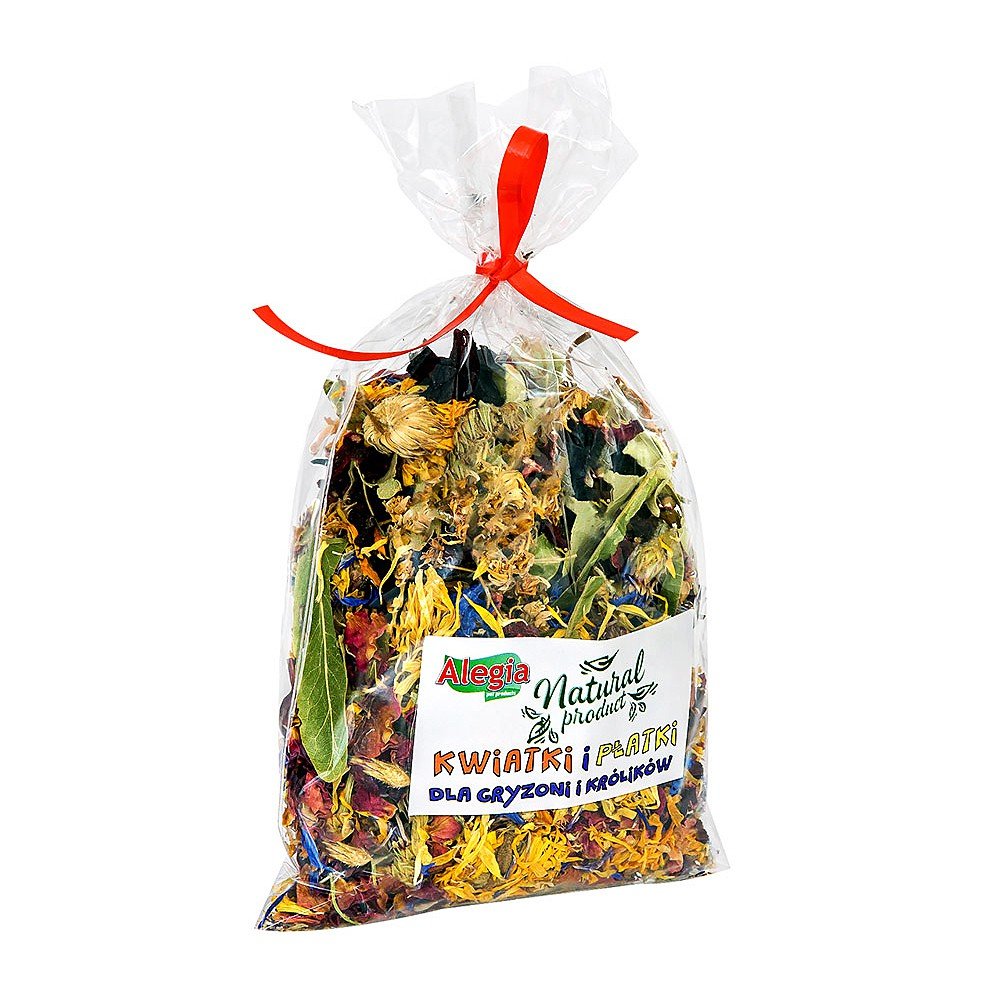 Alegia Kwiatki i płatki 30g jest to specjalnie skomponowana mieszanka kwiatów, która korzystnie wpływa na czynności przewodu pokarmowego, przyswajanie pokarmów, ułatwia trawienie oraz reguluję funkcjonowanie wątroby. Nagietek zawarty w mieszance wykazuję działanie przeciwzapalne, rozkurczowe oraz przeciwbakteryjne. Dodatek płatków róż oraz bławatka sprawia że mieszanka bogata jest w składniki mineralne oraz witaminy. Które są niezbędne gryzoniom oraz królikom do prawidłowego rozwoju. Ponadto hibiskus zawiera antocyjanidy które pomagają usuwać z organizmu wolne rodniki, zawiera także flawonoidy które chronią przed chorobami serca oraz wzmacniają naczynia krwionośne.