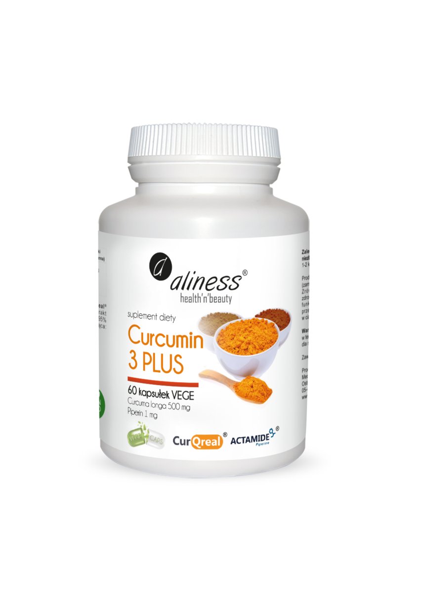 | Nazwa: | Aliness, Curcumin 3 Plus z piperyną 500 mg/1 mg, Suplement diety, 60 kaps. |