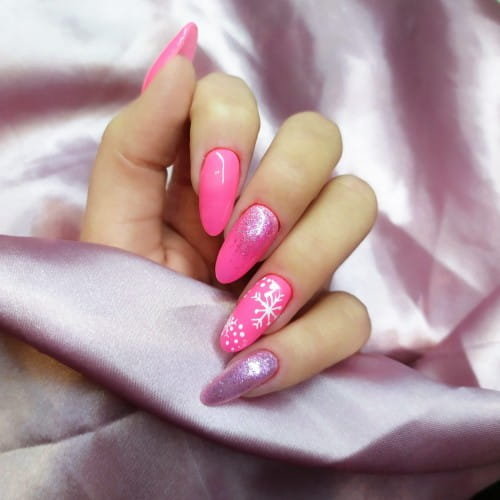 76. Delikatny, cukierkowy róż z iskrzącymi się w słońcu mikrodrobinkami.