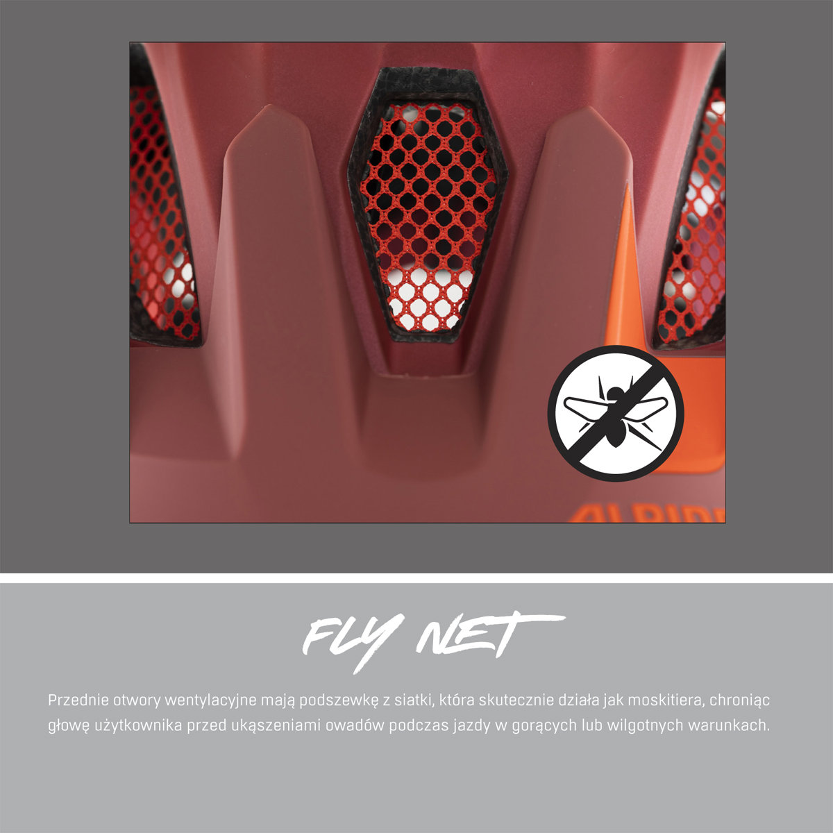 Wbudowany daszek jest szczególnie efektowny, zapewniając ochronę przed bezpośrednim działaniem promieni słonecznych i dodatkowe bezpieczeństwo w przypadku upadku. Zintegrowane z nim trzy otwory wentylacyjne zapobiegają gromadzeniu się ciepła. Kolejne dwanaście otworów zapewnia dobrą wentylację głowy, nawet szczególnie w upalne dni. Moskitiery z przodu zapobiegają przedostawaniu się owadów do kasku. Run System Ergo Flex+ zapewnia komfort i optymalne możliwości regulacji.