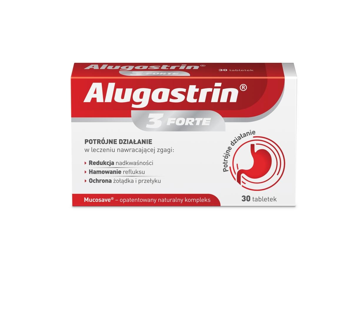 Wyrób medyczny Alugastrin 3 Forte przeznaczony do stosowania w objawowym leczeniu refluksu żołądkowo-przełykowego, w tym: zgagi, refluksu, problemami trawiennymi oraz bólami żołądka.