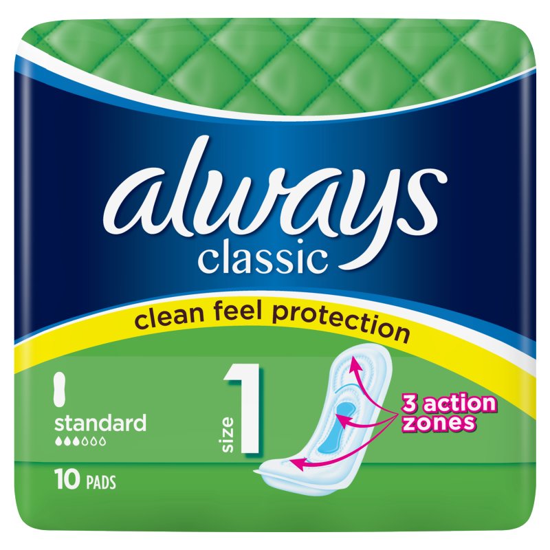 Always Classic Standard to podpaski bez skrzydełek. Zapewniają ochronę i uczucie czystości. 3 strefy działania. Pakowane indywidualnie.