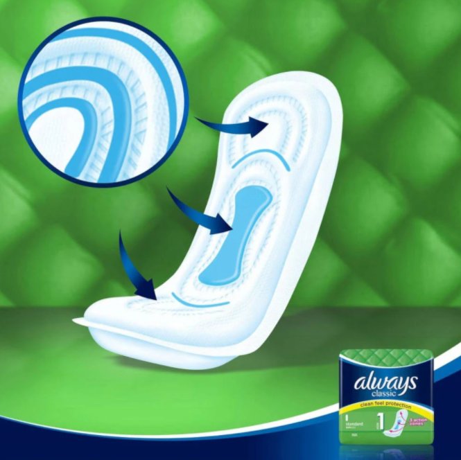 Podpaski Always Classic Standard z potrójnymi strefami działania zapewniają ochronę i uczucie czystości przez cały dzień.