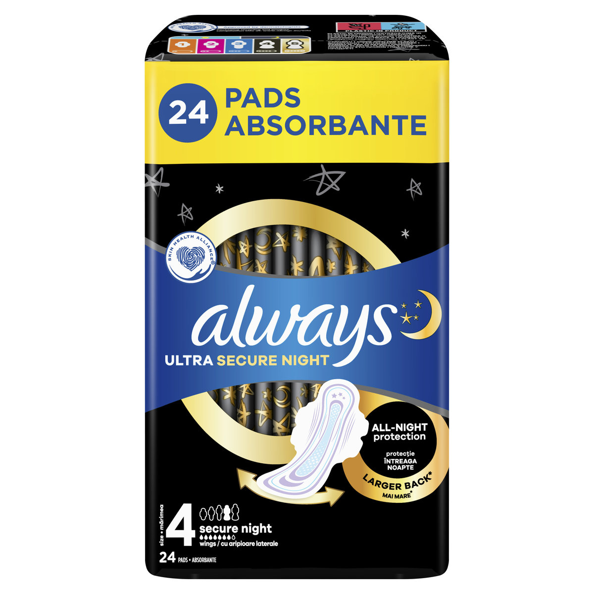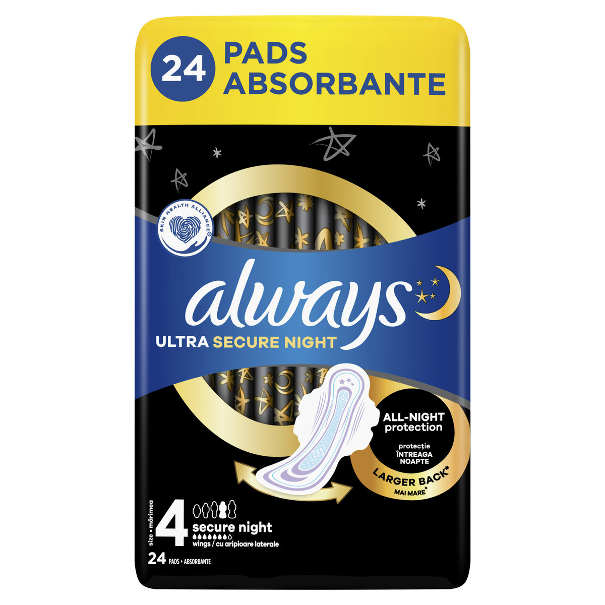 Gwarancja dobrej nocy dzięki podpaskom higienicznym ze skrzydełkami ALWAYS Ultra Secure Night (rozmiar 4). Zaprojektowane z myślą o potrójnej ochronie, dzięki czemu nie musisz budzić się i sprawdzać, czy podpaska przeciekła, i zmieniać jej w środku nocy. O 60% większy tył* w połączeniu z technologią LeakGuard wiąże wilgoć i pomaga zapobiegać przeciekaniu podczas nocnych krwawień. System InstantDry wchłania wilgoć w kilka sekund i utrzymuje ją z dala od Twojej skóry. Podpaski są wyposażone w technologię OdourLock, która neutralizuje przykre zapachy, dzięki czemu możesz czuć się świeżo i czysto. Śpij spokojnie dzięki potrójnej ochronie Always Ultra.