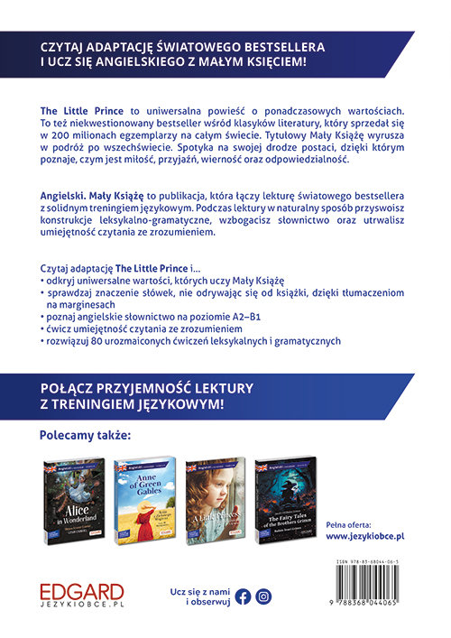 Angielski. Mały Książę to publikacja, która łączy treść światowego bestsellera z treningiem językowym. Podczas lektury w naturalny sposób przyswoisz konstrukcje leksykalno-gramatyczne, wzbogacisz słownictwo oraz utrwalisz umiejętność czytania ze zrozumieniem. Książka została dostosowana do potrzeb osób dorosłych, które miały już styczność z językiem angielskim i są na poziomie początkującym (A2) i średnio zaawansowanym (B1).