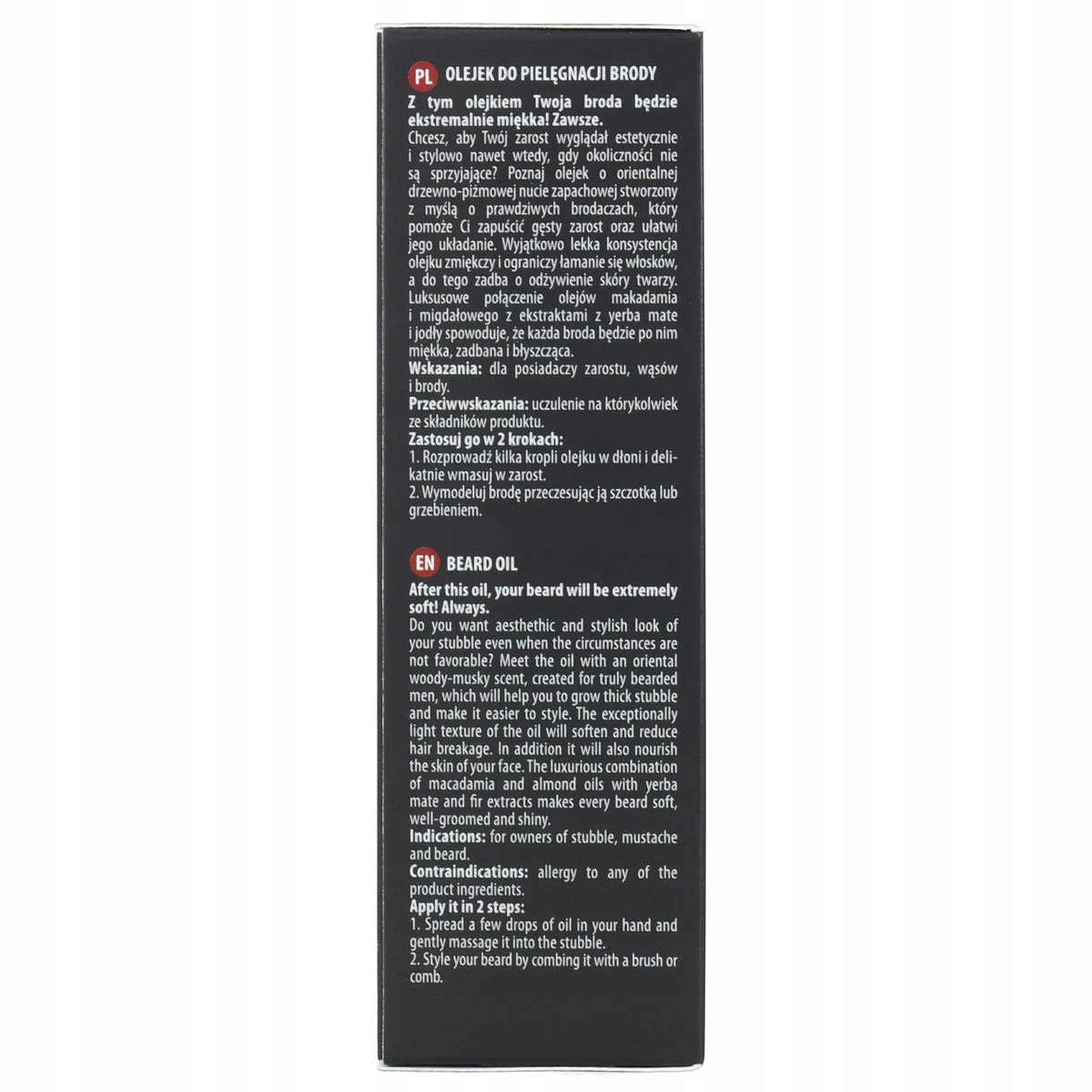 Olejek o orientalnej drzewno-piżmowej nucie zapachowej został stworzony z myślą o prawdziwych brodaczach. Pomoże zapuścić gęsty zarost oraz ułatwi jego układanie. Wyjątkowo lekka konsystencja olejku zmiękczy i ograniczy łamanie się włosków, a do tego zadba o odżywienie skóry twarzy. Luksusowe połączenie olejów makadamia i migdałowego z ekstraktami z yerba mate i jodły spowoduje, że każda broda będzie po nim miękka, zadbana i błyszcząca.