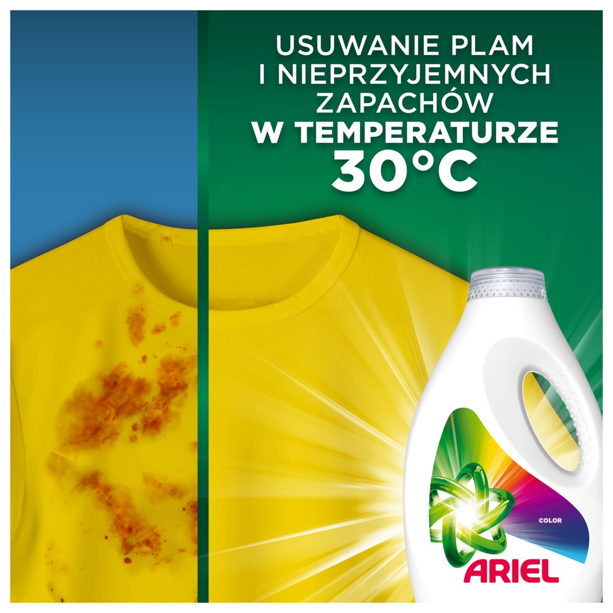 Płyn do prania Ariel Color, rekomendowany przez Whirlpool, Candy, Beko i Electrolux, usuwa uporczywe plamy i nieprzyjemne zapachy nawet w niskich temperaturach – od 30°C. Jego specjalna formuła została opracowana z myślą o krótkich cyklach prania i niższych temperaturach, dzięki czemu oszczędzasz energię, nie rezygnując z czystości. Dla najlepszych efektów napełnij zieloną nakrętkę płynem i umieść ją bezpośrednio w bębnie pralki. Uwaga: ze względu na ochronę środowiska, nakrętka z miarką nie jest dołączana do każdej butelki, ale możesz ją zamówić bezpłatnie na stronie ariel.info.